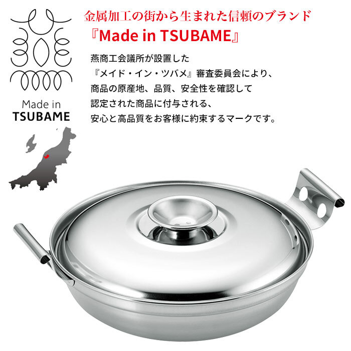 | 金属加工の街から生まれた信頼のブランド「Made in TSUBAME」 一人鍋にちょうどいいあつあつの鍋物や煮込みうどんにぴったりなステンレス製寄せ鍋17cm。 IH200V対応。 「Made in TSUBAME」は燕商工会議所が接地した「メイド・イン・ツバメ」の審査委員会より、商品の原産地、品質、安全性を確認して認定された商品に付与される、安心と高品質をお客様にお約束するマークです。 |