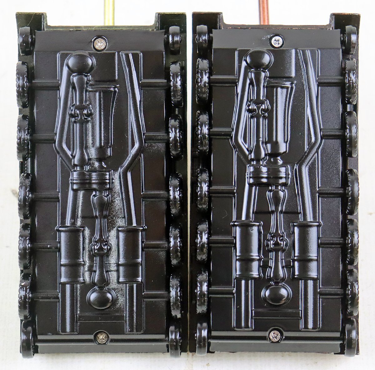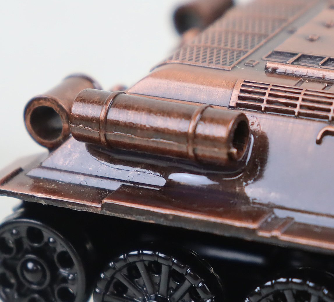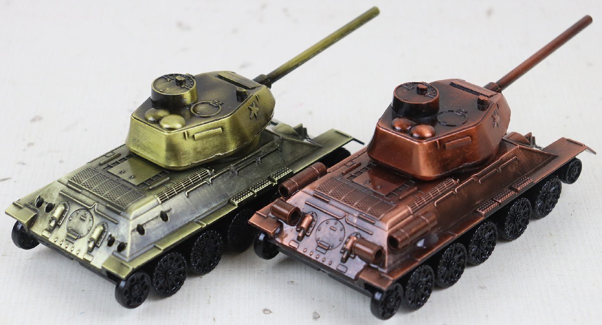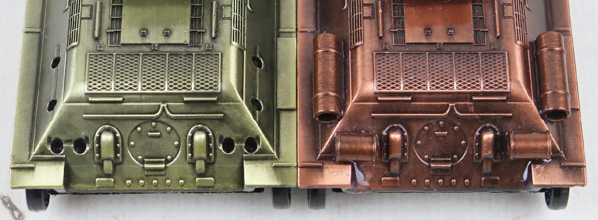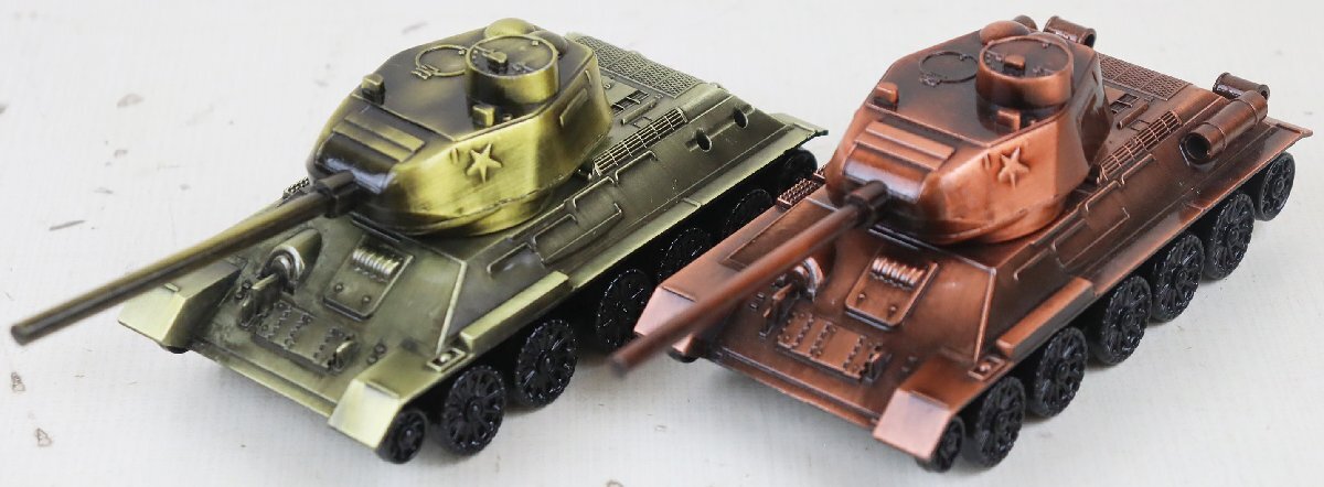 | S★中古品★模型/インテリア 戦車の置物 2両セット メーカー等詳細不明 T-34か 全長:約17cm 重量:約250g 本体のみ ※1両燃料タンクなし (1115087I) *中古品です。 模型/インテリア 戦車の置物 2両セット メーカー等詳細不明 全長:約17cm 重量:約250g ※モデルはT-34ではないかと思われますが、断言はできかねます。 *付属品 付属するものはありません。商品写真に掲載したものが全てです。 *外観 若干のスレ・キズ等があります。 金色の車両は後部の燃料タンクがありません。銅色の車両は接着剤で固定されており、溢れた接着剤が固まっています。 金色の車両は砲塔を回すとやや引っかかりを感じます。逆に銅色の車両は軽く回る(緩い)ように感じます。 金色の車両の底部に、製造時に塗装しきれていない領域があります。 | ||