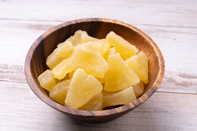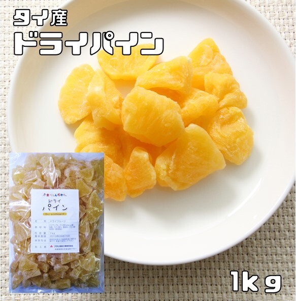 ★タイ産のPatteruia種のパイナップルを使用したドライフルーツです。清涼感のある味わいが特徴で、さわやかな香りと酸味がお楽しみ頂けます。しっとりとした柔らかタイプで食べやすい1口サイズにカットしてあります。 ★お子様のおやつやお菓子作りの材料に最適です。そのままお召上がり頂けます。紅茶や日本茶などにも合いますし、細かく刻んでフルーツケーキやヨーグルト、シリアルなどにご利用頂けます。 ★内容量 1袋 1kg ★賞味期限 製造から180日 ★保存方法 常温(直射日光、高温多湿を避けて保存してください。)  ★原材料 パイナップル(タイ産Patteruia種)、砂糖、パイン果汁、酸味料(クエン酸)、保存料(亜硫酸塩)