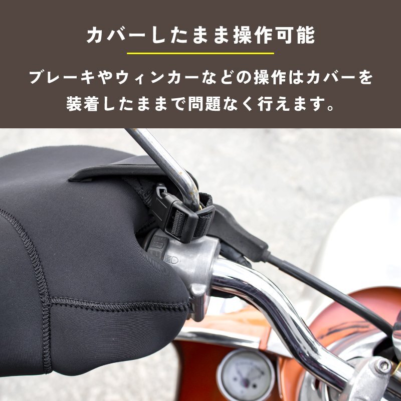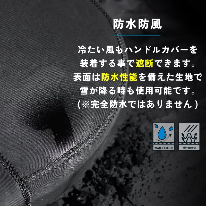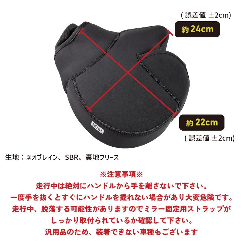 バイクを乗るとかじかんで辛い指先の冷え、手の冷えがすごい気になる方におすすめのハンドルカバー。 ハンドルカバーを取付ける事でハンドルの中は[ぽかぽか暖かく]辛かった日々にお別れです。 厚手のネオプレーン製は防風、防水に優れておりハンドルカバー内を快適にします。 また伸縮性と耐摩擦性に優れていて扱いやすい。 冬の季節の冷たい風や急な雨を防ぎ暖かく快適にバイクで走行できます。 袖口も広く出し入れも簡易。 様々なバイクに使用可能。ミニバイク、スクーター、ビックバイクまで幅広い車種の対応 車輌・仕様等により取付には加工が必要な場合や使用できない場合がございます。 [防寒対策] かじかんで辛い指先の冷えに対策に効果的。ハンドルカバーを取付ける事でハンドルの中は[暖かく] 冬の冷たい風や冷たい雨を防ぎます。 寒い季節でも指先暖かく快適にバイクに乗る事が可能に。 [厚手のネオプレーン素材] [ネオプレーン]耐摩耗性、耐水性・耐候性と耐寒性、クッション性等の様々な要素で優れている素材です。 ウェットスーツにも使用されるネオプレーン素材。 合成ゴム素材の一つで強度保ちながら耐熱性と耐寒性に優れているので冬の防寒カバーに最適な素材です。 [保温性抜群] 裏地は柔らかな肌触りを持ち保温性と快適性を促進する生地です。適度な厚さで、寒い季節でも指先暖かくて快適に。 [防風防水] 冷たい風もハンドルカバーを装着する事で遮断できます。 表面は防水性能を備えた生地ので、雪が降る時も使用可能です。(※完全防水ではありません) [夜間安全反射] 暗闇でライト等の光をを反射して存在をアピールします。 視認性が良くなり夜間の安全性を向上します。 [簡単装着] ハンドルカバーの装着はとても簡単で装着・脱着をスムーズに行えます。 [様々なバイクに使用可能] ミニバイク、スクーター、ビックバイクまで幅広い車種の対応。 車輌・仕様等により取付には加工が必要な場合や使用できない場合がございます。 商品内容バイク用ハンドルカバー 生地ネオプレイン、SBR、裏地フリース サイズ幅24 x長さ22 cm(誤差値±2cm) 仕様裏地フリース仕様、防水防風ネオプーレン ※注意事項※走行中は絶対にハンドルから手を離さないで下さい。 一度手を抜くとすぐにハンドルを握れない場合があり大変危険です。 走行中、脱落する可能性がありますのでミラー固定用ストラップがしっかり取付られているか確認して下さい。 汎用品のため、装着できない車種もございます ・商品は入荷によりキズがある場合があります。 その場合、保証対象外になりますのでご了承お願い致します。 ・ディスプレイ環境により実物と色が異なる場合が有ります。 ・入荷時期により予告無く一部仕様変更する場合が有ります。 |