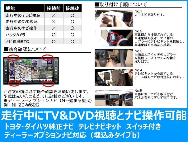 | ■視聴制限を常時解除 走行中のテレビ&DVDの視聴制限を常時解除することが出来ます。 ■ナビ操作制限も解除 付属のスイッチを使い走行中のナビ操作制限も一時的に解除することが出来ます。 ■連動機能への弊害無し バックカメラやETCも問題無く動作しますので、安心してご利用いただけます。 ■簡単取付&安心設計 純正配線に当商品を中継させてアース線を接続するだけの簡単設計です。 また、純正カプラーに中継させるカプラーオンタイプを採用しておりますので、純正配線を加工すること無く取付が出来ます。 【重要】ご購入前に必ずご確認下さい。 対応パネル及び適合機種が決まっておりますので事前にスイッチ取付パネルサイズと適合機種を確認の上 ご注文願います。 また、スイッチ取付パネルサイズが合わない場合は、埋め込みスイッチ タイプBをご検討下さい。 ※ページ記載の参考車種以外でもパネルサイズが合えば取付可能です。 ※誤ってご購入された場合に発生する送料等の費用については、お客様負担となります。 ■テレビ視聴&ナビ操作 制限解除キット ⇒埋め込みスイッチ タイプB 購入はこちら |