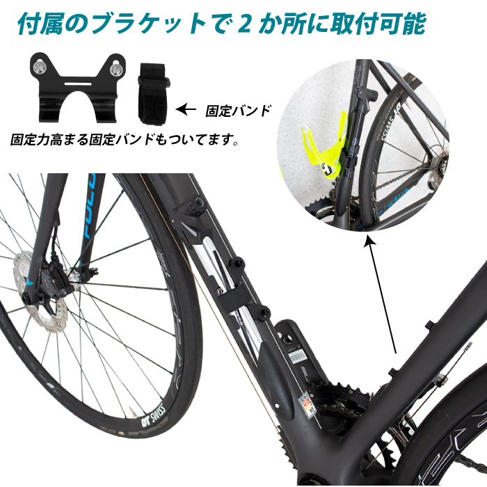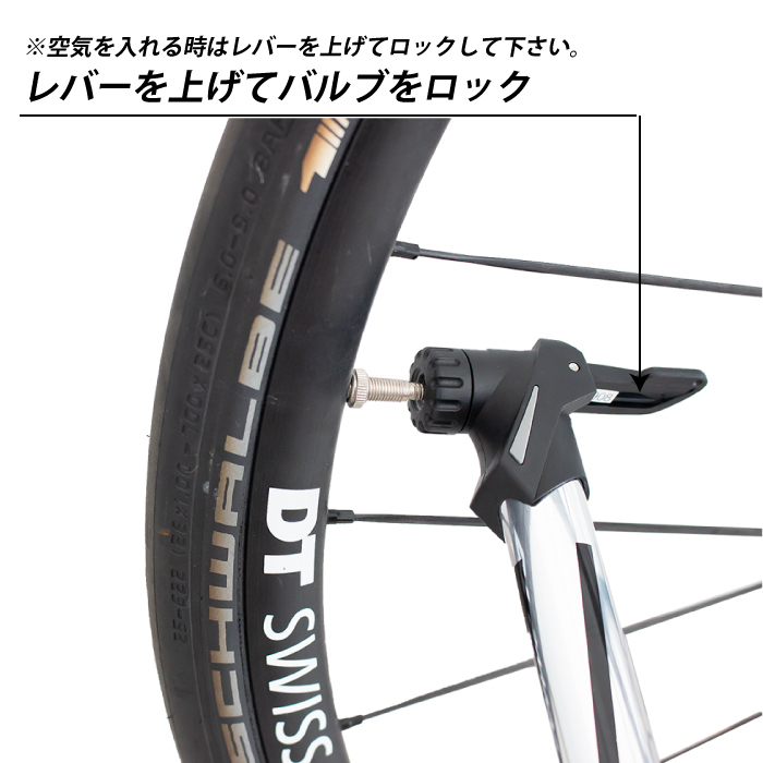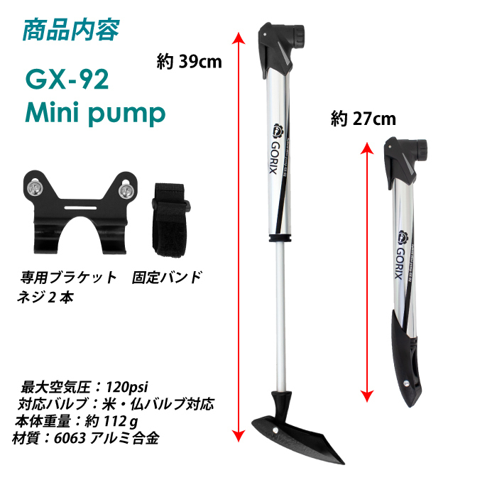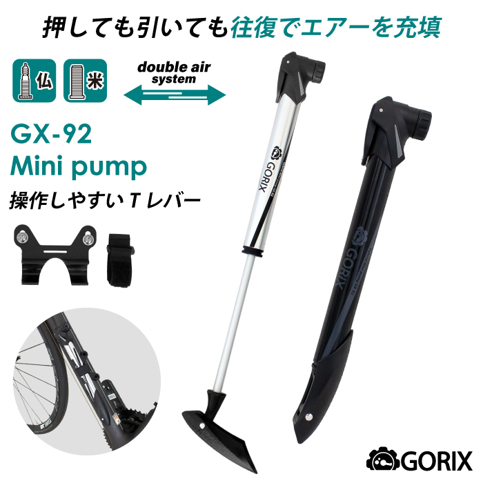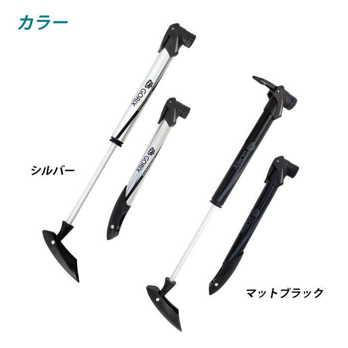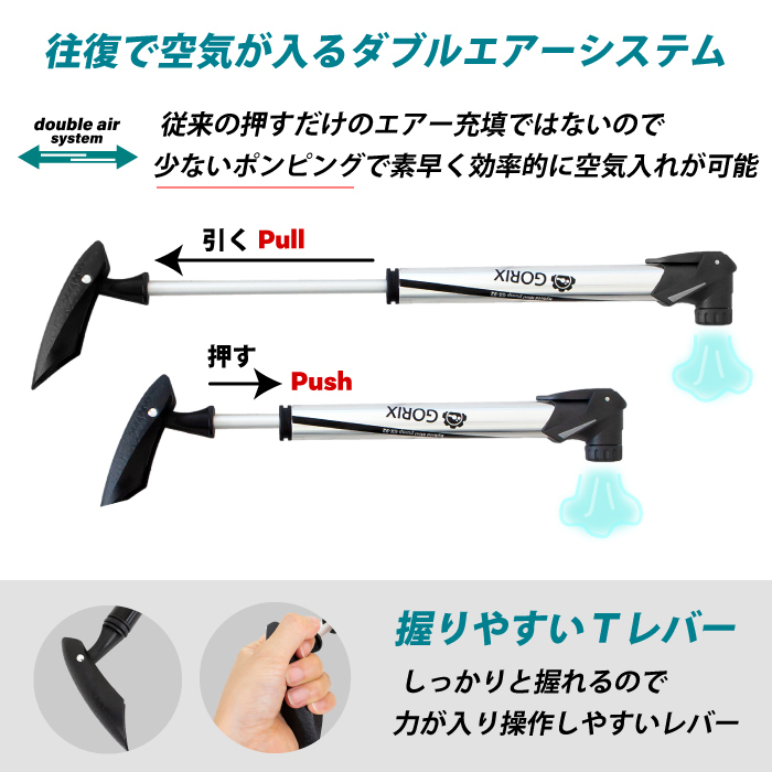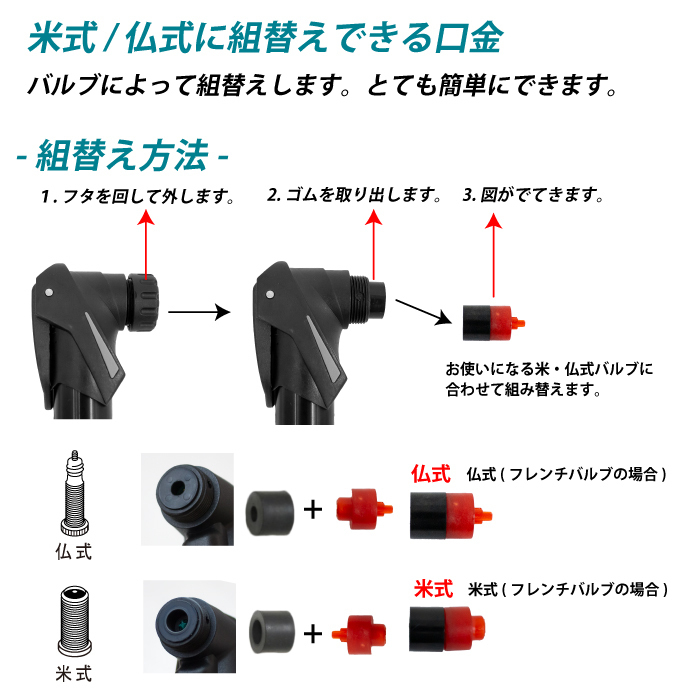| 押しても引いてもエアーが充填できて少ないポンピングで空気を入れる事が可能 往復でエアーを充填できるので素早く効率的に空気を補充します。 米式 / 仏式に組替えできる口金 ・握りやすく、力が入りやすいTレバー ・専用ブラケットでボトルケージに取付け可能 ・コンパクトサイズで邪魔にならず ・ロードバイクやクロスバイク、マウンテンバイクなどに ・フレンチバルブ(仏式)米式で使えます。 ・きれいなテカリかかったシルバーカラーと落ち着いたマットブラックの2色 内容 本体サイズ 商品内容:ポンプ、専用ブラケット、固定バンド、ネジ2本 サイズ:約27cmx4cmx3cm、シリンダー径2.14cm 本体重量:約112 g 材質:6063アルミ合金 最大空気圧:120psi 対応バルブ:米・仏バルブ対応ヘッド | |