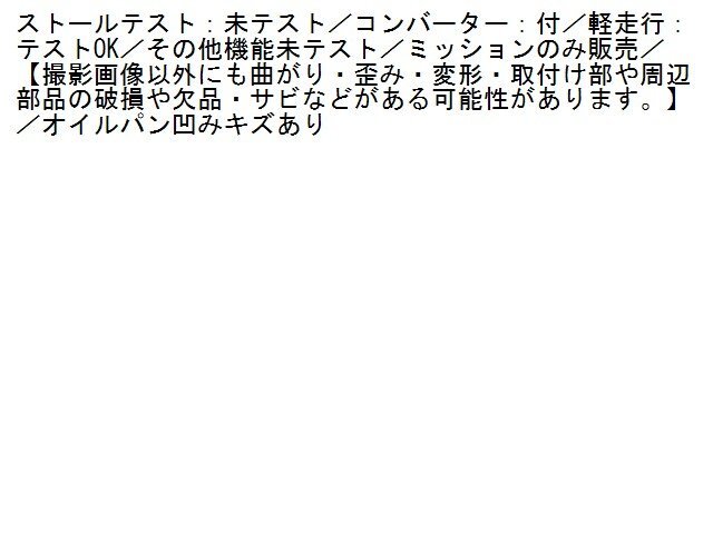 | 商品情報 | ストールテスト:未テスト/コンバーター:付/軽走行:テストOK/その他機能未テスト/ミッションのみ販売/【撮影画像以外にも曲がり・歪み・変形・取付け部や周辺部品の破損や欠品・サビなどがある可能性があります。】/オイルパン凹みキズあり | ||