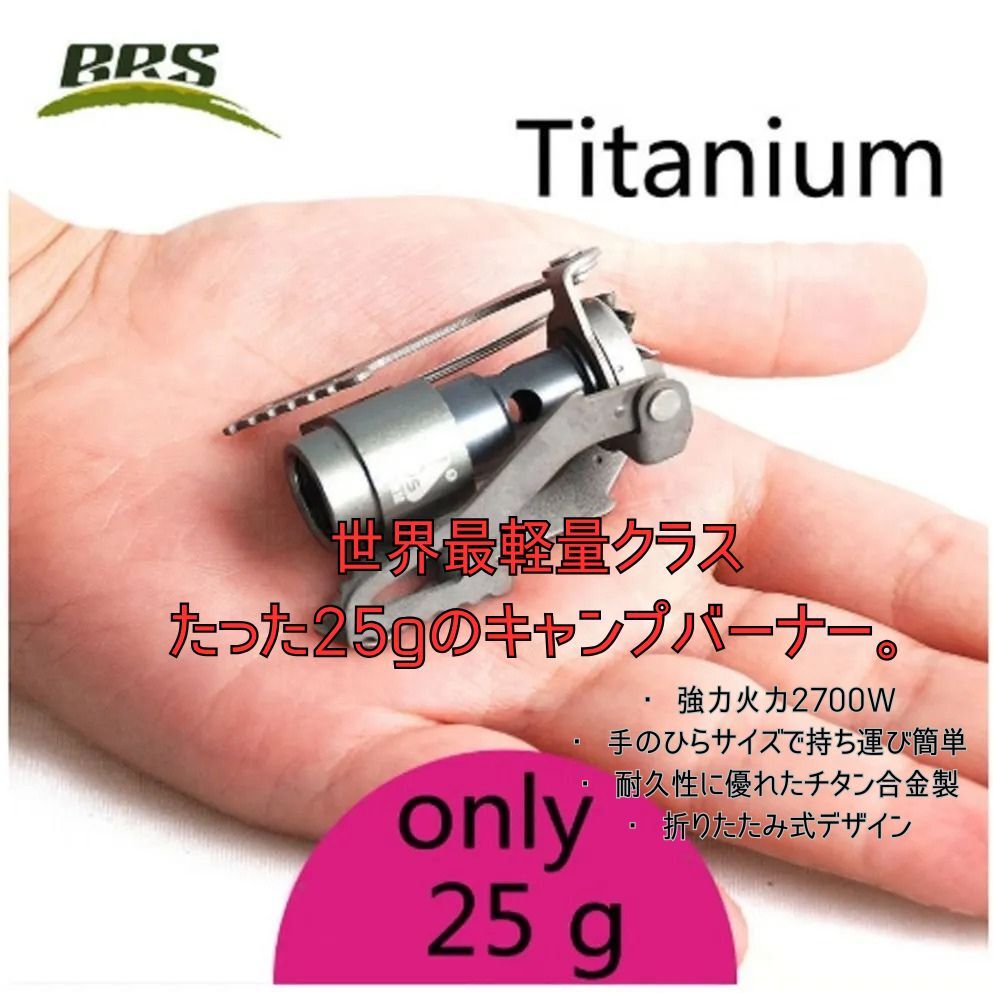 BRS-3000Tは、わずか25gの超軽量チタン製キャンプバーナーです。 登山・キャンプ・ツーリングなど、荷物を極限まで軽量化したい方に最適。 高火力ながら驚くほどコンパクトに収納でき、持ち運びにも便利です。 ■ 特徴 ● 超軽量設計(わずか25g) 手のひらサイズでポケットにも収まるミニマルデザイン。 ● 高火力・安定燃焼 チタン素材と精密加工により、風に強く安定した炎を実現。 ● コンパクト収納 折りたたみ式設計で、収納袋付き。 バックパックやポケットにもラクラク収納可能。 ● 優れた耐久性 チタン合金構造により、軽量でありながら長寿命。 ● 高地・低温環境でも使用可能 アウトドアや登山など、過酷な環境にも対応。 ■ 仕様 ・ 型番:BRS-3000T ・ 材質:チタン合金 ・ 重量:約25g ・ 展開サイズ:約Φ85×68mm ・ 収納サイズ:約Φ37×52mm ・ 火力出力:約2700W ・ 燃料タイプ:ブタンガス(OD缶) ・ 燃焼時間:約3時間(最大火力時) ・ 沸騰時間:約2分58秒(500ml基準) ・ 点火装置:なし(ライター等で着火) ・ 付属品:専用収納ポーチ(BRSロゴ入り) ■ 使用方法