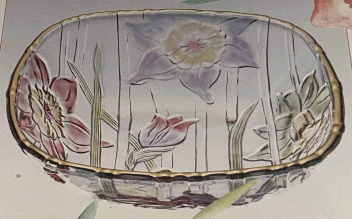 手描きの花模様が美しいガラス製の四角形ボウル。