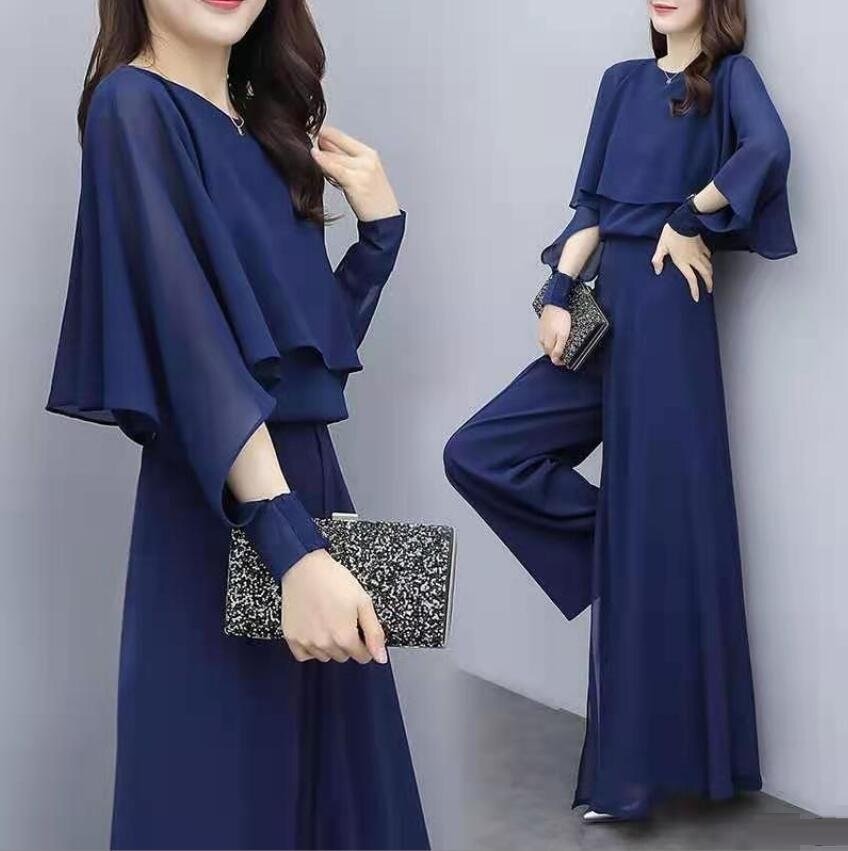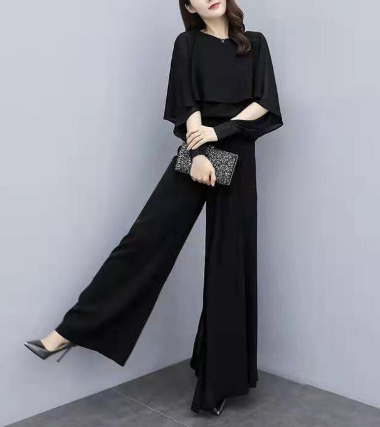 レディース上下パンツ スーツ 無地 オシャレ シフォン ドレス オフィス セットアップ フォーマル★黒/Lサイズ