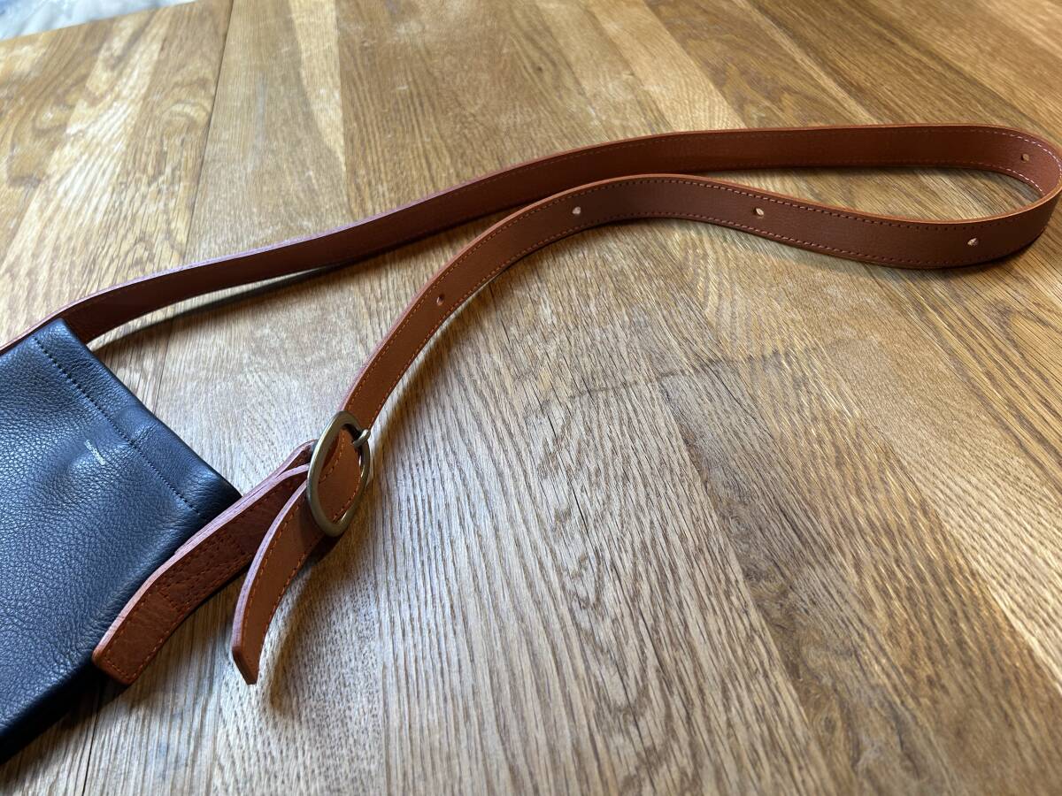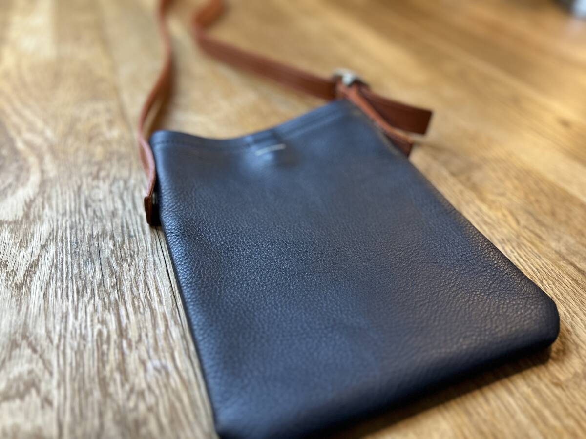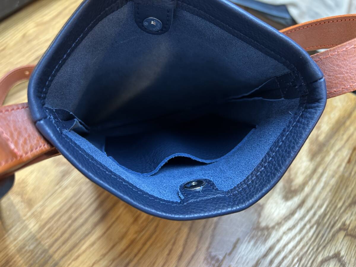 日常的に使い勝手がよい小ぶりなサイズで、本体は濃いめのネイビー、ショルダー部は少しオレンジっぽいベージュになっていて、
