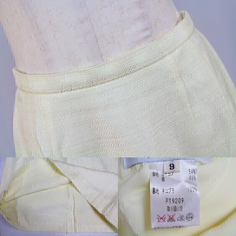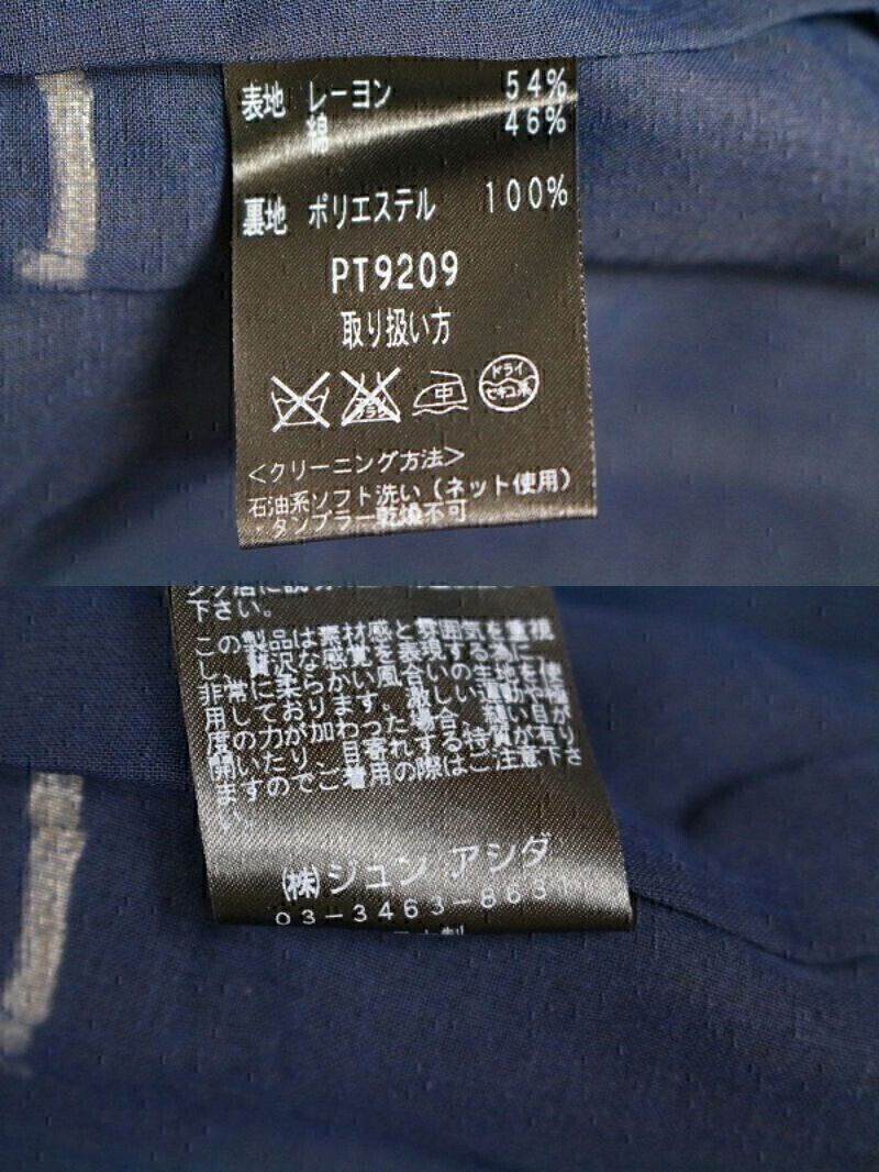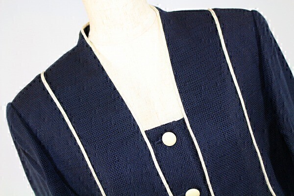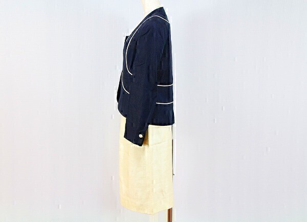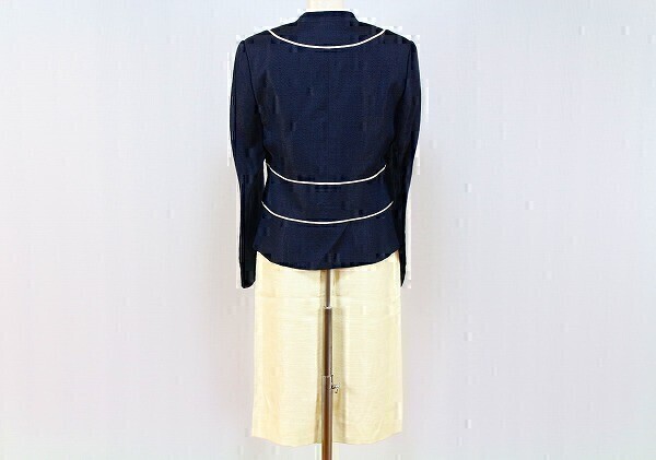 ※肩パットが付いています。 【表記サイズ】 9 【カラー】 紺・薄い黄トor薄いクリーム系 ※撮影時や画面の明るさにより色が変わる場合がありますのでご了承ください。 【実寸サイズ】 (ジャケット)肩幅 38㎝・着丈 55㎝・身幅 90㎝・袖丈 58.5㎝ (スカート)ウエスト 63㎝・ヒップ 96㎝・総丈 61㎝ ※平置き素人採寸の為、多少の誤差はご理解下さい。 【商品状態】 画像8枚目のように襟部分の白い部分に薄い黄ばみぽいのがありますがその他は綺麗な状態です。 ※スカートに糸引きがあります。 ※一人で状態確認をしています。見落とす場合もありますのでご了承下さい。 |