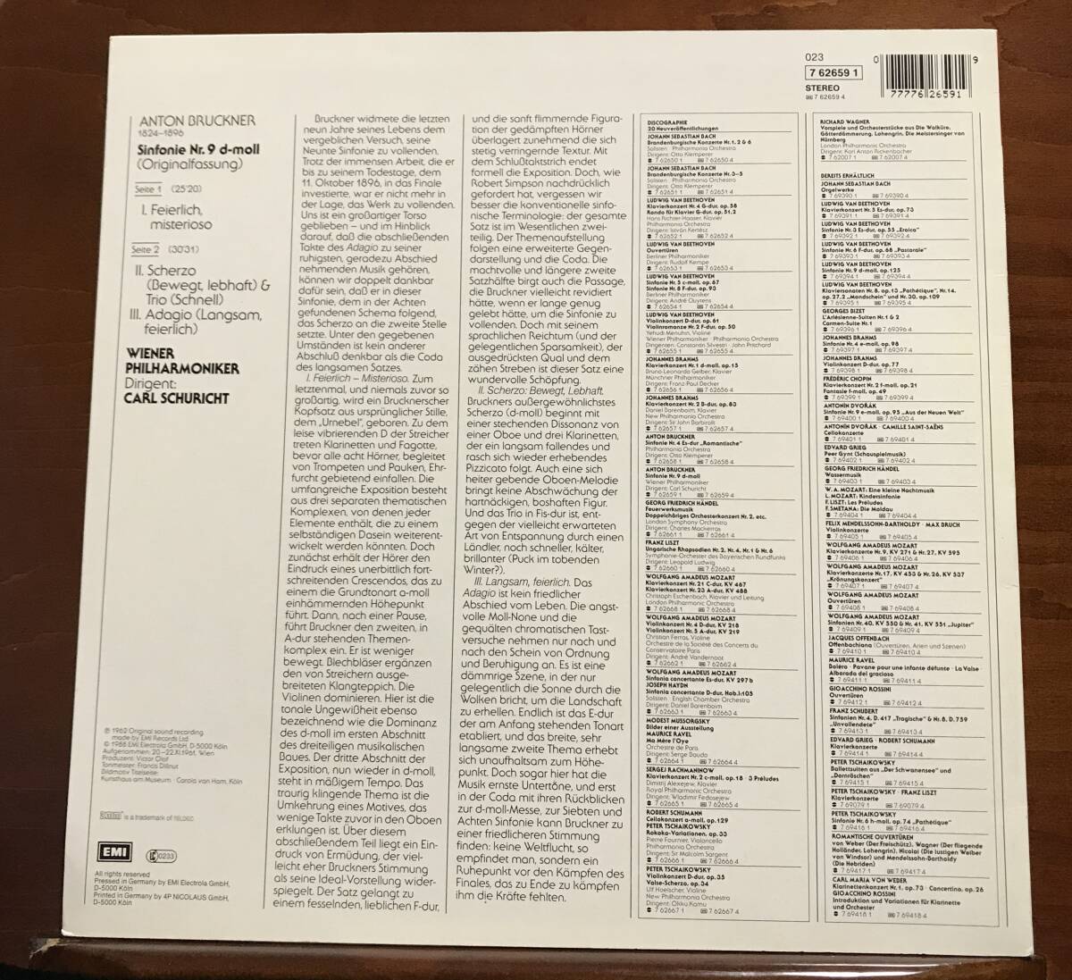 | 中古のシューリヒト指揮 ウィーン・フィル 演奏 ブルックナー:交響曲 第9番のアナログディスクです。 独EMI 0237626591。ドイツプレス。大犬。激レア。高音質。 シューリヒトの屈指の名演。ウィーン・フィルの魅力的な音色が生かされており、ムジークフェラインでの録音ということもあり広い空間再現性、特にホルンの柔らかい音が際立ち随所にブルックナーの神々しい音楽が展開され素晴らしい演奏です。彼岸の美しさを湛えた神演を当盤でご堪能頂ければ幸いです。 高音質な当盤でご堪能いただければ幸いです。 当商品はアナログディスクです。ご注意下さい。 盤面の年代からすると綺麗な部類です。スレあり。あくまでも発売から50年程経過した中古であることをご理解ください。 外観は写真をご参照ください。 ノークレーム&ノーリターンでお願い致します。 発送はヤフネコ宅急便です。 自己紹介覧もご覧ください。当方のオークションのお取引に関してのご案内を記入しています。 以上、宜しくお願い致します。 【曲目】 ブルックナー: 交響曲第9番 【演奏】 カール・シューリヒト, ウィーン・フィルハーモニー管弦楽団 【録音年】 1961年 ウィーン ムジークフェラインザール | |||