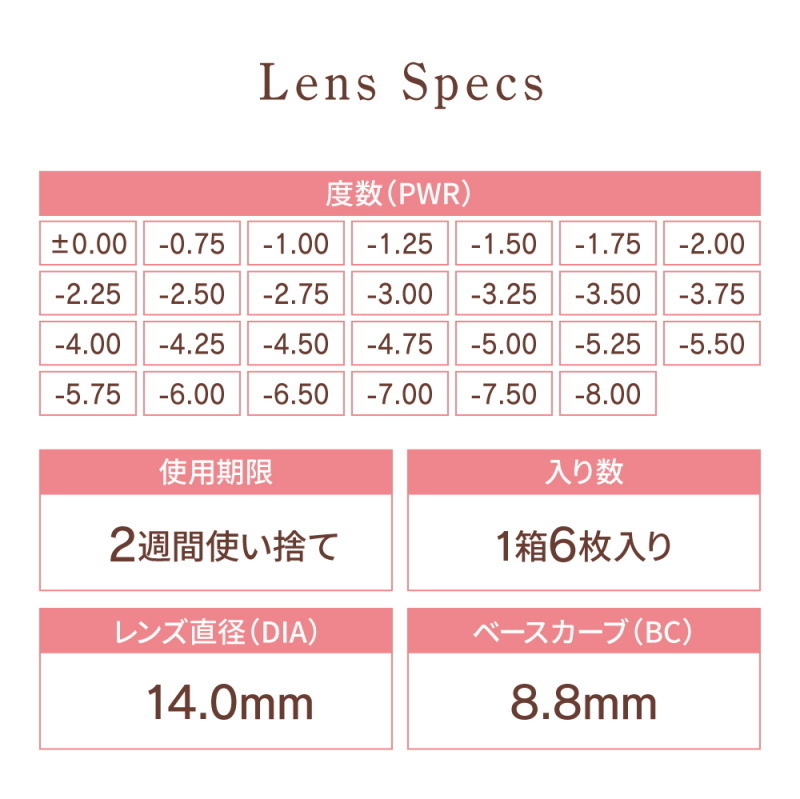 ・度数:±0.00、-0.75~-6.00(0.50step)、-6.50~-8.00(0.50step)