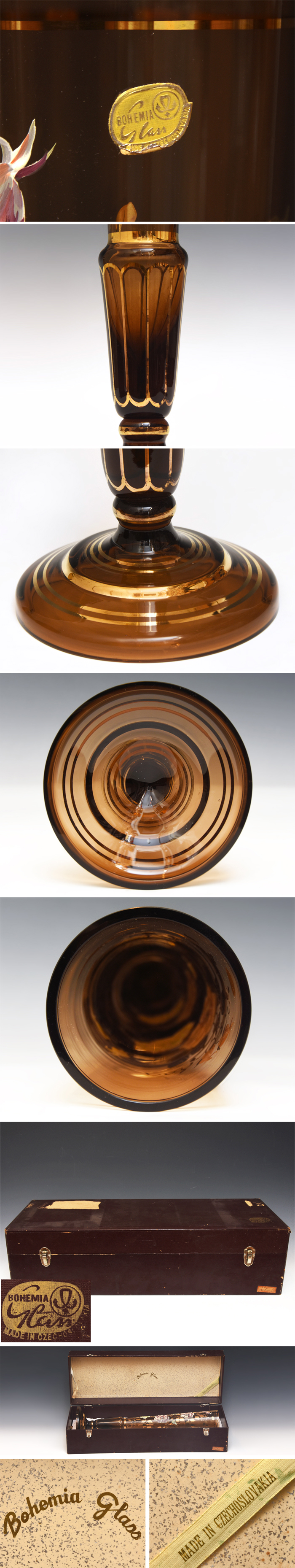ボヘミア エナメル彩 花文 ガラス 花瓶です。 薄いブラウン色のガラスの素地にハンドペイントのエナメルによる花文や金彩で装飾が施されている。とても華やかな一品です。 スレや使用感がございます。 ※予めご了承の上ご入札お待ちしております。 ※撮影の際に生じた写り込みなどがございます。 ご理解の程よろしくお願い致します。 |