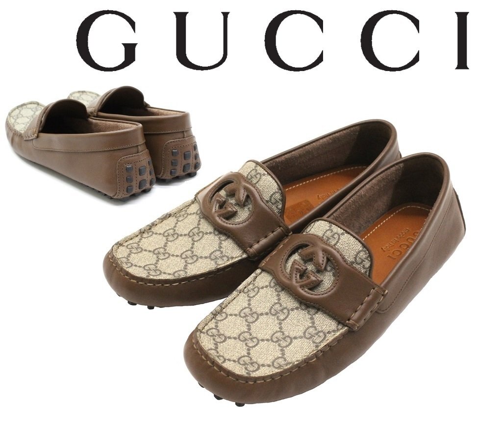 18万新品◆8=27cm◆GUCCIグッチ GGスプリーム キャンバス×レザードライビングローファーシューズ ブラウン茶