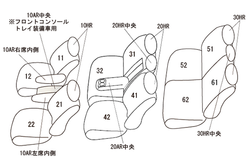 | 適合形状 | 2列目6:4分割チップアップシート 快適温熱シート(シートヒーター)標準装備→対応 ※シートカバーを装着することで3列目シート跳ね上げ時、車体側にロックをかける際、シートを車体側に押すサポートが必要になります。 カバーは上記の作業に考慮して、最小限の厚みにしています。 ※コンソールボックスのフタ用にカバー(10AR中央)が付属していますが、シートカバーを装着することでフタを閉じてロックをかける際、フタを押し込む力が必要になります。 |