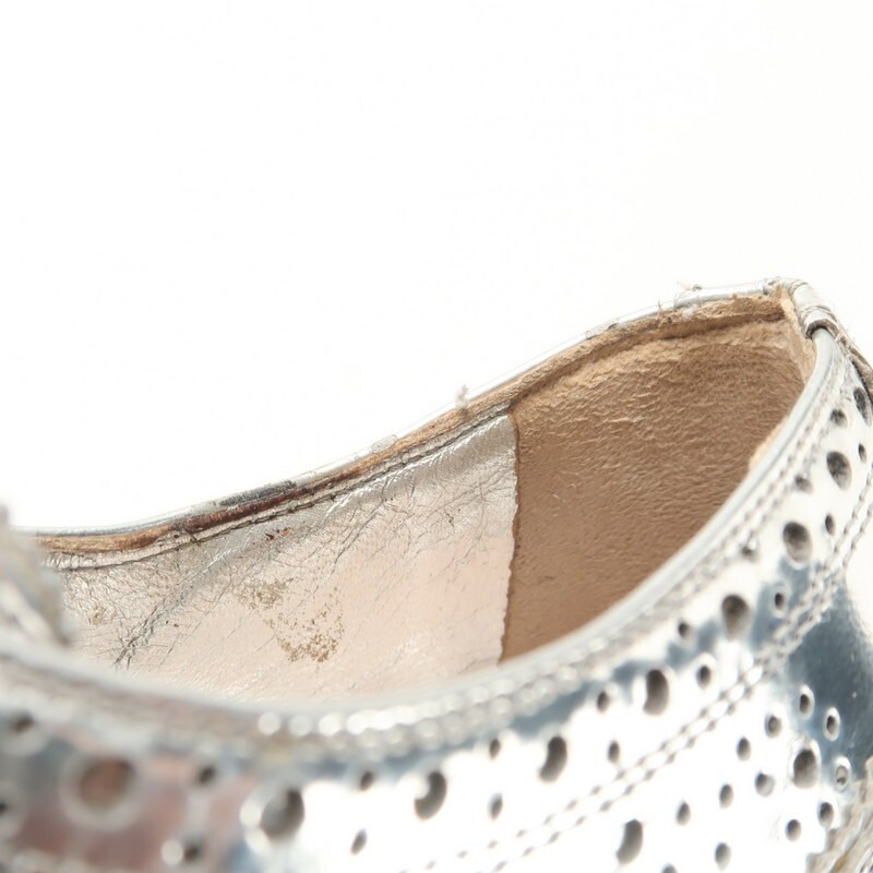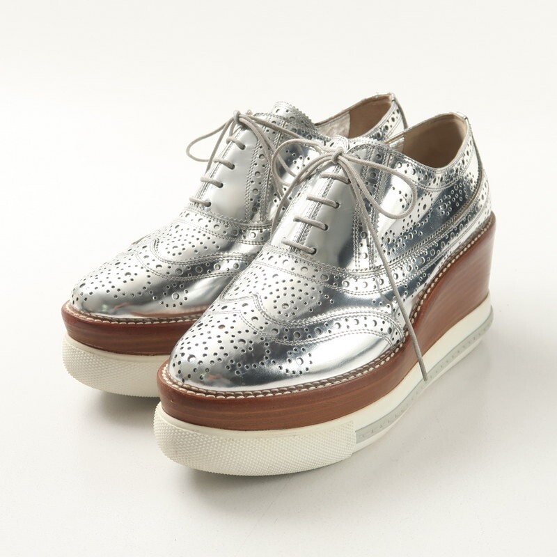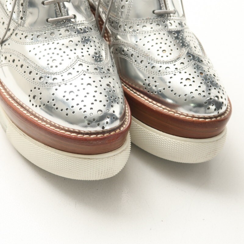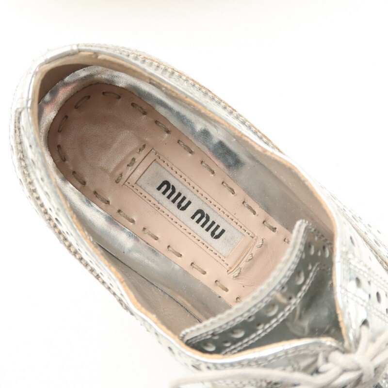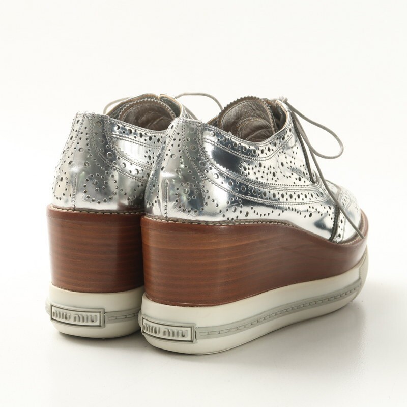 | MI3854〇ミュウミュウ*メタリックレザー ウイングチップ ウッド/プラットフォーム レースアップシューズ*36(23cm相当)*靴*シルバー系 | |||