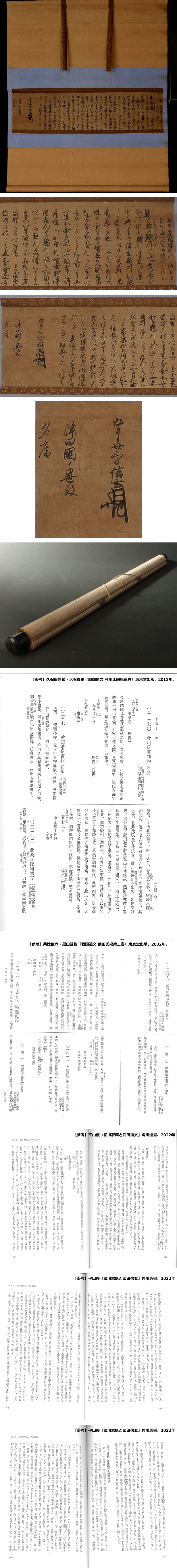 武田信玄の書状です。 永禄12(1569)年5月23日、織田一族・津田国千世と織田信長の右筆武井夕庵に宛てた書で、徳川家康が今川氏真を懸川(掛川)で下した後、武田氏を裏切り北条氏政および氏真と和睦したことを詰る内容の書状です。『戦国遺文』今川氏編及び武田氏編所載品で、元は明治期の蔵書家・神田孝平の蔵書とみられます。 武田信玄は駿河侵攻の過程で遠江国に干渉しており、信長の仲介の元、永禄11(1569)年、家康が誓詞、信玄が血判状を提出する事態となっています。これに先立つ甲三同盟も織田信長の仲介で行われており、信長と家康は対等な同盟関係を築いていたものの、信玄は家康を信長より格下の存在とみなしていたことが本書状などより窺えます。そして信玄は没するまで家康の実力を誤解しつづけていたといわれます(平山優『徳川家康と武田信玄』)。戦国史研究の重要史料といえる逸品です。 ◆武田信玄 戦国-織豊期の武将。武田信虎の長男。父を駿府の今川氏のもとへ追放して甲斐の国主となる。信濃の諏訪,伊那などを攻略,川中島で越後の上杉謙信と数度にわたってたたかう。駿河をも支配し,北条氏と和議をむすんだのち元亀3(1572)年京都をめざして軍をすすめ,織田信長の同盟軍徳川家康を三方原でやぶったが,翌4(1573)年病没。53歳。幼名は勝千代。名は晴信。 ◆津田国千世 戦国-織豊期の武士。武田方との外交を担った織田忠寛(掃部助)の息子とみられ、父が甲斐に派遣されていた間は尾張国日置城で留守を預かったと考えられる。 ◆武井夕庵 戦国-織豊時代の武将。 はじめ美濃の斎藤家の家臣。のち織田信長の右筆奏者として重用され外交面でも活躍した。天正2(1574)年信長が東大寺正倉院の名香蘭奢待をきりとったとき奉行をつとめた。号は爾云。 ◆神田孝平 幕末-明治期の洋学者,官僚。蕃書調所で数学をおしえる。新政府につかえ,明治3(1870)年に起草した「田租改革建議」は地租改正に影響をあたえた。兵庫県令や元老院議官をつとめ,明六社にも参加。貴族院議員。明治31(1898)年没、69歳。美濃出身。名は孟恪。号は淡崖。著作に「経世余論」,訳書に「経済小学」など。 〔本文〕 (尚々書) 追而、上使瑞林寺・佐々伊豆守 越後へ通候、津田掃部助者為談合 一両日已前着府候、 態令啓候、懸川之地落居、 今河氏真駿州河東江被退之 由候、抑去年信玄駿州へ出張 候処、氏真没落、遠州も悉 属当手、懸河一ヶ所相残候キ、 経十余日、号信長先勢家康 出陣、如先約遠州之人質等可 請取之旨候間、任于所望候シ、其 以後北条氏政可救氏真、駿州 薩タ山へ出勢、則信玄対陣、 因茲向于懸川数ヶ所築取之 地候故、懸川落城候上者、氏真 加生害候歟、不然者三・尾 両国之間へ可相送之処ニ、小田原衆・ 岡崎衆、於于半途遂会面、号 和与、懸川籠城之者共、無恙 駿州へ通候事、存外之次第候、 既氏真・氏康父子へ不可有和睦 之旨、家康誓詞明鏡候、此所 如何信長御分別候哉、但過去 之儀者不及了簡候、せめて此上 氏真・氏康父子へ露敵対之色 候様、従信長急度御催促 肝要候、為曲可有木下源 左衛門尉口上候間、不能具候、恐々謹言、 五月廿三日 信玄(花押) 津田国千世殿 夕庵 付属:時代箱が付属します。 寸法:高さ85cm、幅71cm(最大幅。若干の誤差はご了承下さい) 状態:経年のイタミがございます。 |