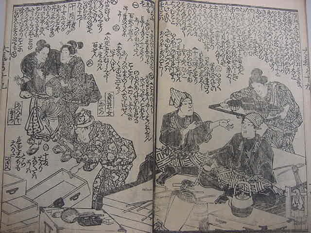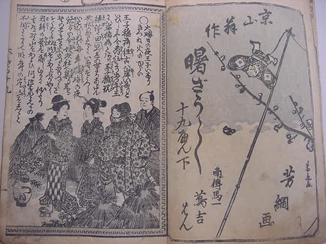嘉永6年(1853)に刊行された木版オリジナル和本『大晦日曙草紙』19編、全2冊揃合1冊です。名戯作者・山東京山と一流浮世絵師・歌川芳綱による素晴らしいコラボ作品です。狐妖怪絵や露店の書店などスゴイ内容です。表紙絵の色目も極良好です。保存状態も概ね可です。江戸時代のスグレタ絵入小説をお見逃しなく!