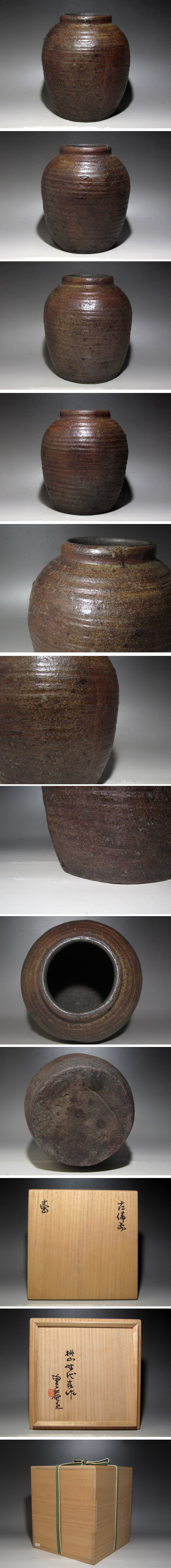 桃山時代の古備前壷です。 趣のある景色の素晴らしい逸品です。 箱蓋裏に初代黒田陶々庵の極めがあります。 サイズ 直径18.5cm/高さ21cm(多少の誤差はお許しください) 状態 口部に欠けや直しが施されています。 骨董品という事をご勘案頂き、時代経過のスレや、小さな傷がある場合があるかもしれませんのでご承知置きください。 | |||