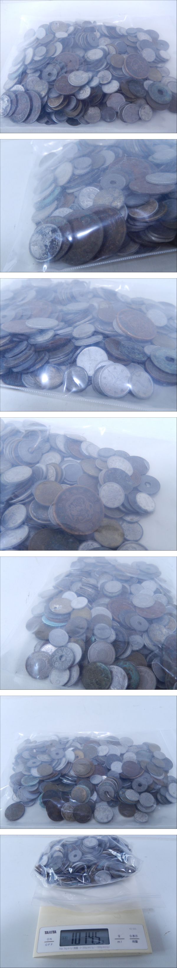 | ご覧いただきありがとうございます。 【商品名】 古銭 銅貨 錫貨 アルミ貨 等 まとめて 1kg以上 大量 まとめ売り 【商品詳細】 古い日本の古銭まとめて出品になります。 【状態】中古 個人の主観になりますが、外観はそれぞれ比較的きれいなもの、痛みのあるもの等様々な状態だと思います。まとめて出品になりますのでご理解ください。 あくまで個人の見解になりますので写真にてご判断下さい。 保管品の為、多少の小キズ・擦れ、写真に写りきらない汚れ等ある場合が ございます。ご理解頂ける方のみご参加ください。 【サイズ】 重さ:約1014.5g (素人計測になります。) 【付属品】 写真のものがすべてになります。 【発送】 ゆうパック:60サイズ レターパックプラス:600円 定形外:1350円 (レターパック・定形外は簡易梱包) | ||