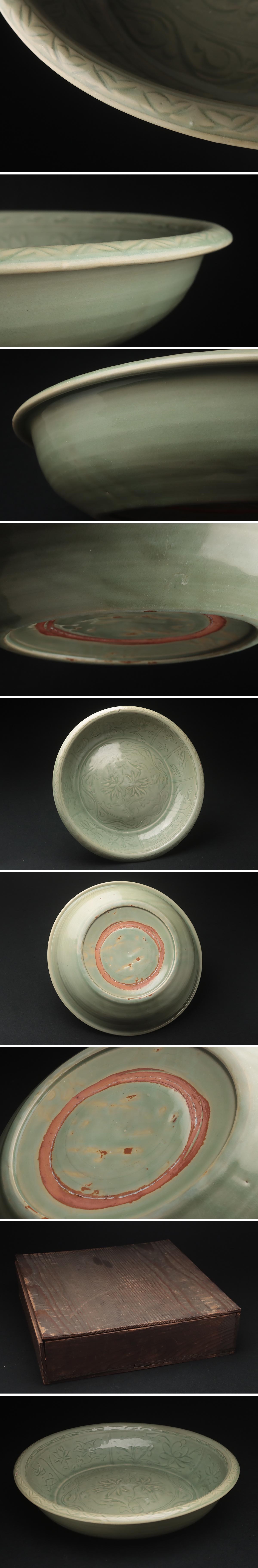 | ◆ 中国古玩 青磁陰刻草花文大皿 径36cm 木箱附・龍泉窯青釉刻花卉紋大盤・盛皿・青瓷皿 唐物 中国古陶磁 中国古美術 明時代 ◆