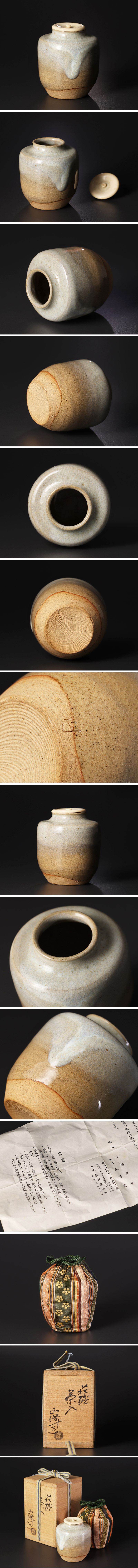 落ち着いた造形に釉の流れる趣深い景色が魅力的な茶入です。相良間道の仕覆が付属いたします。 ★商品は小高正峰の作品である事を保証致します。 |