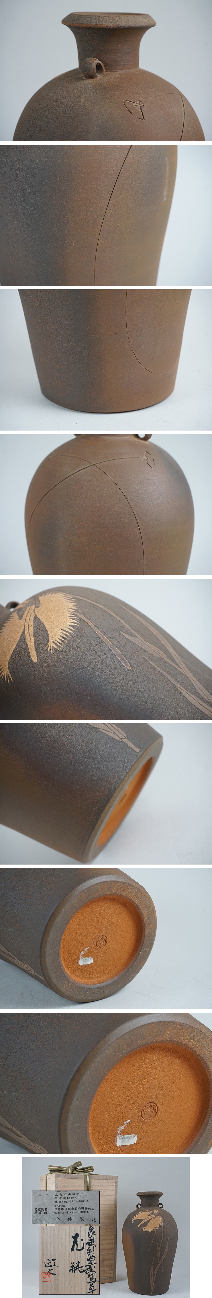 ![]() ![]() 未使用 今井政之 窯変鷲草花瓶です。 共箱在銘、保管擦れご了承下さい。大きなダメージはありません。 画像ご参考の上ご入札ください。 高さ21.1cm 幅12.0cm 口径5.5cm 高台径7.9cm 重さ1,013g | |||