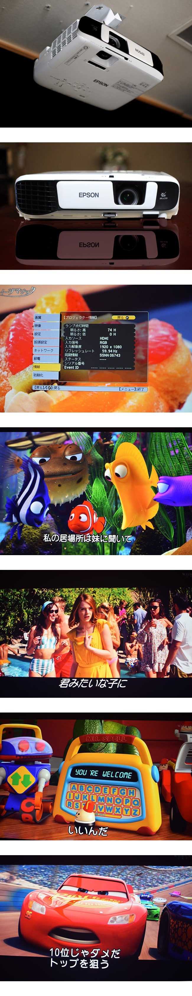色彩鮮やかに濃密・鮮明な映像です。3600ルーメンの高輝度はさすがに明るく、スクリーン全体に力強さがあり、部屋の照明下でも高い視認性があります。ランプ使用時間少ないため鮮鋭感のある映像が映し出されています。細部表現力や階調表現力も秀逸で、低照度シーンの微妙な陰影表現から高輝度シーンのハイライト表現までEPSON 3LCDらしい濃密な色彩で描き分けているのがわかり、彩度の高い映像で色純度の高さが印象的です。実写映像は添付写真をご覧ください(120インチホワイトマットスクリーンに当出品機で実際に投射した映像です)。