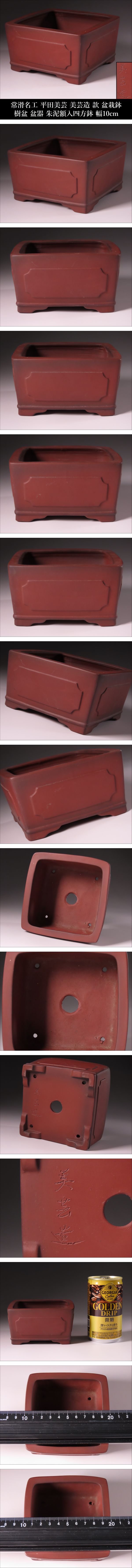 【ONE'S】常滑焼名工 平田美芸 美芸造 款 盆栽鉢 樹盆 盆器 朱泥額入四方鉢 幅10cm 古美術品 | |||