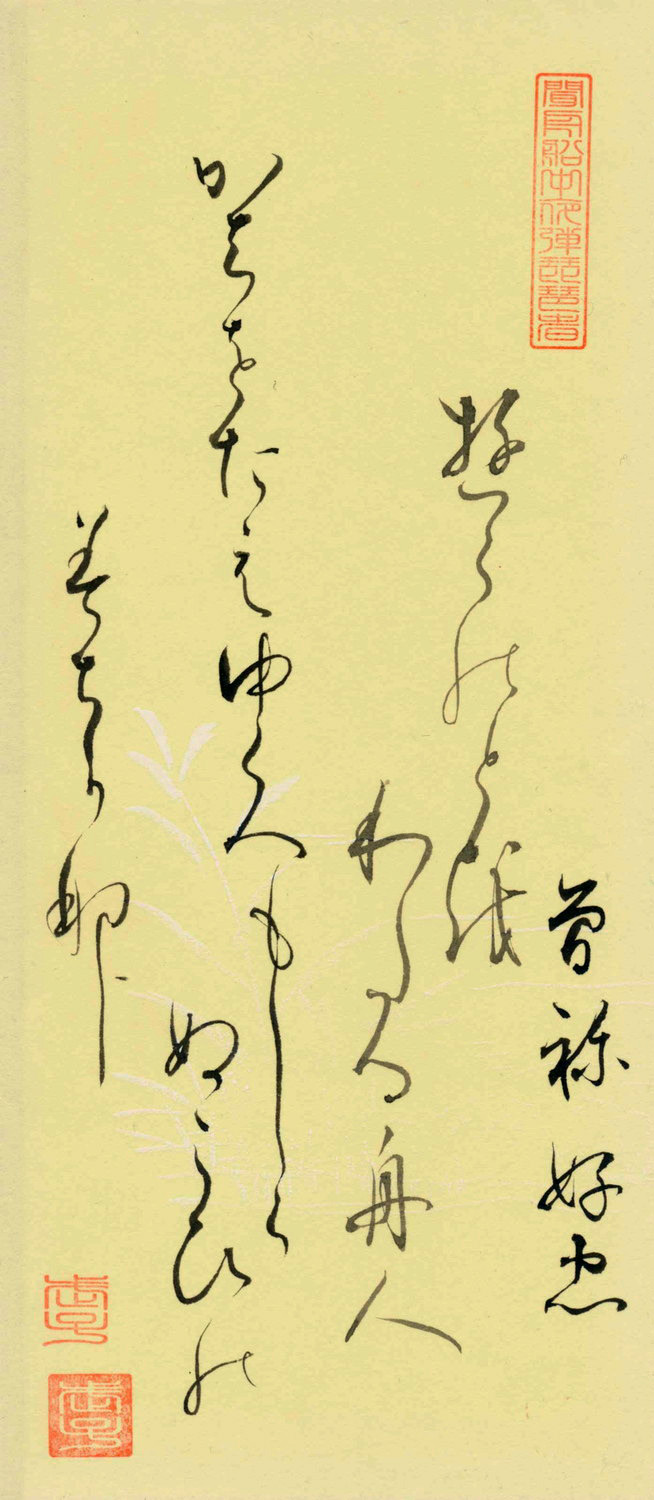 原本自筆上部には、「舟船(しゅうせん)の中に夜、琵琶を弾く者を聞く」《舟の中から夜、琵琶を奏でているのが聞こえてきた。》白楽天の元和十年(815年)江州での作。琵琶行という有名な漢詩です。