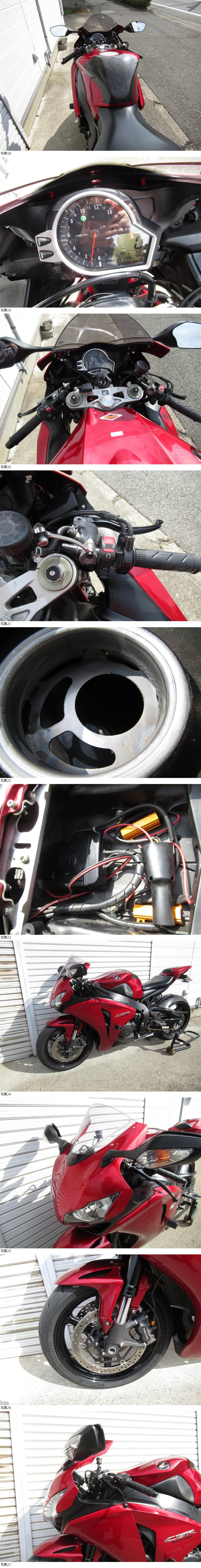 | 商品説明 | ホンダCBR1000RR SC59 の出品です☆ エンジンの始動動画も下記にありますので、ご検討中の方はよければご確認ください。☆ 商品詳細 メーカー:ホンダ 車名:CBR1000RR 年式:2008年11月/平成20年11月 車体番号:SC59-101※※※※ 型式:EBL-SC59 原動機型式:SC59E 登録書類:有(自動車検査証) 車検:令和9年1月 走行距離表示値:18200KM 乗車定員:2人 車検記載距離 令和7年1月(10600KM) 令和4年8月(10100KM) 走行距離最大値(36100KM) メーター故障のためメーター交換と聞いており走行は約5万キロほど エンジン;実動 状態:現状車 鍵×2本(メイン、タンク、シート同一キー) ※センタースタンドは撮影用のため付属しません ☆☆☆CBR1000RR エンジン始動動画はこちら☆☆☆ ☆☆☆CBR1000RR エンジン始動動画はこちら☆☆☆ ※動画はグーグルでパソコンでご確認ください。 エンジンは動画のようにセルで始動します。☆ 走る止まる確認済みです。☆ □□□カスタム□□□ □オートショップスガハラ ECU書き換え等(国内仕様→フルパワー加工) □アクラポビッチ レーシングライン フルエキゾースト チタンサイレンサー □Puig スモーク ハイスクリーン □ハンドルバーエンド □クレバーウルフ カーボンタンクカバー □ カーボンリアインナーフェンダー □NAO フェンダーレスキット □リフレクター □ウェビックモード LEDシーケンシャルリヤウインカー □シングルシートカウル □フェイズ バックステップ(ブラック) □BabyFace レーシングフック ブラック □モリワキ エンジンマウントスライダー □モリワキ スタンドフックローラーM8 □K-FACTORY ラジエターコアガード □二輪専用ETC(JRM-11) □社外セルモーター(純正の納期が未定だった為社外品に交換) □カーボンチェーンカバー □RKチェーン 530シールゴールドチェーン □SUNSTAR フロントススプロケット □SUNSTAR リアアルミゴールドスプロケット □brembo フロントブレーキマスターシリンダーφ19レバーレシオ20mm □メーカー不明 フロントブレーキフルードリザーバータンク □ACパフォーマンスライン ステンレスメッシュブレーキホース(ブラック/ゴールド 前後) □デイトナ ブレーキパッドハイパーシンタードパッド(前後) □タイヤ前後 ミシュラン Power GP2(約1,500~2,000km走行)6〜7部山前後 フロント2024年20週目製造:リヤ2024年16週目製造 リアタイヤサイズ変更 190/50ZR17→190/55ZR17 □□□付属品□□□ □純正タンデムシート □純正タンデムベルト □純正タンデムステップ □純正エキゾーストパイプ □純正サイレンサー □取扱説明書 中古車のため多少小傷などはあります、現状有姿渡しでの出品になります。点検整備後にご乗車お願いします☆ |