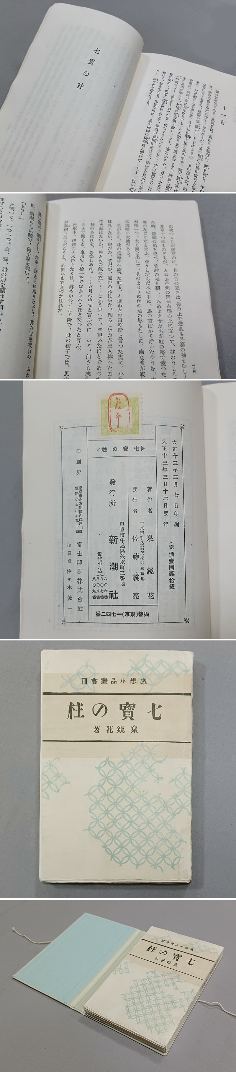 | ★泉鏡花 短編集★恩地孝四郎 装丁、『七宝の柱』大正13年、初版、新潮社、外装無し完本★生田敦夫(洗竹亭)旧蔵、保存用拵えタトウ付き、感想小品叢書 | ||||||||||||||||||