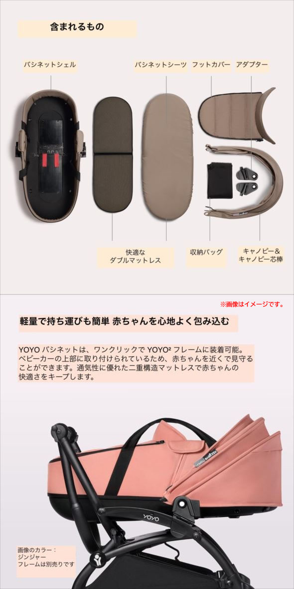 【商品特長】 YOYO2ベビーカーは、瞬時に開閉でき、折りたたんで肩に掛けたり、狭い場所でも楽々収納できます。 電車、バス、タクシー、飛行機での移動も手軽に。 YOYO2ベビーカーはお子さまとともに成長します。 YOYO バシネットは、ワンクリックで YOYO2フレームに装着可能。 装着後も YOYO2 の操作性や柔軟性は変わりません。 バシネットはベビーカーの上部に取り付けられているため、 赤ちゃんを近くで見守ることができます。通気性に優れた二重構造マットレスで赤ちゃんの快適さをキープします。 軽量で持ち運びも簡単。YOYO2フレームにワンクリックで装着してお散歩に出かけましょう。 ・通気性の高いシェルとキャノピー。 ・頭から足元まで赤ちゃんをしっかり保護 ・小物を収納できるインナーポケット付き。 ・UVカット(UPF 50+)撥水加工素材。 | |||||||||||||||