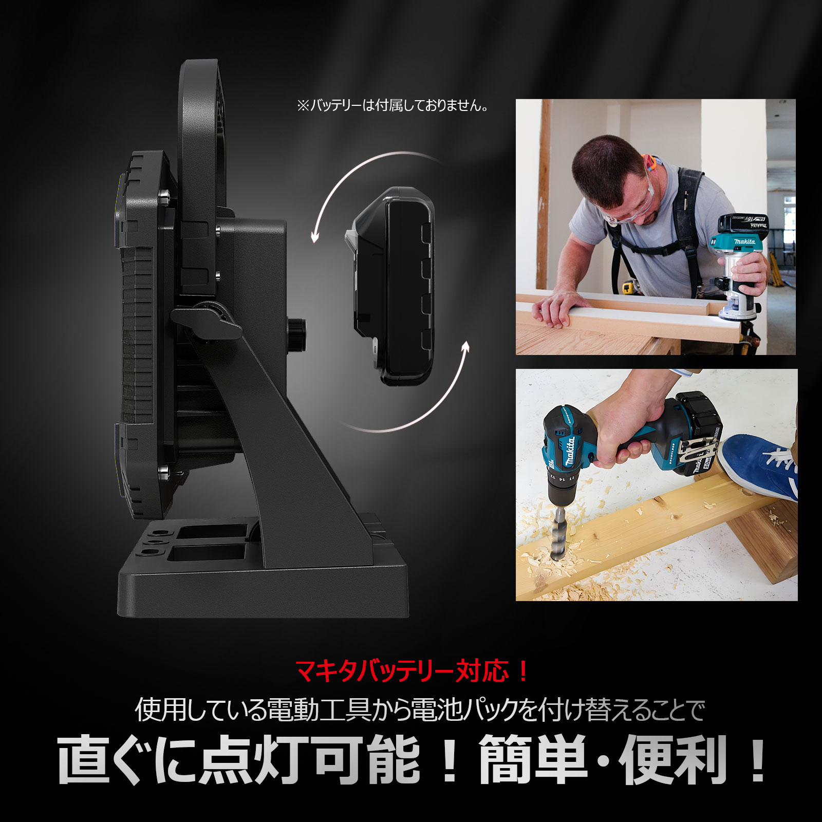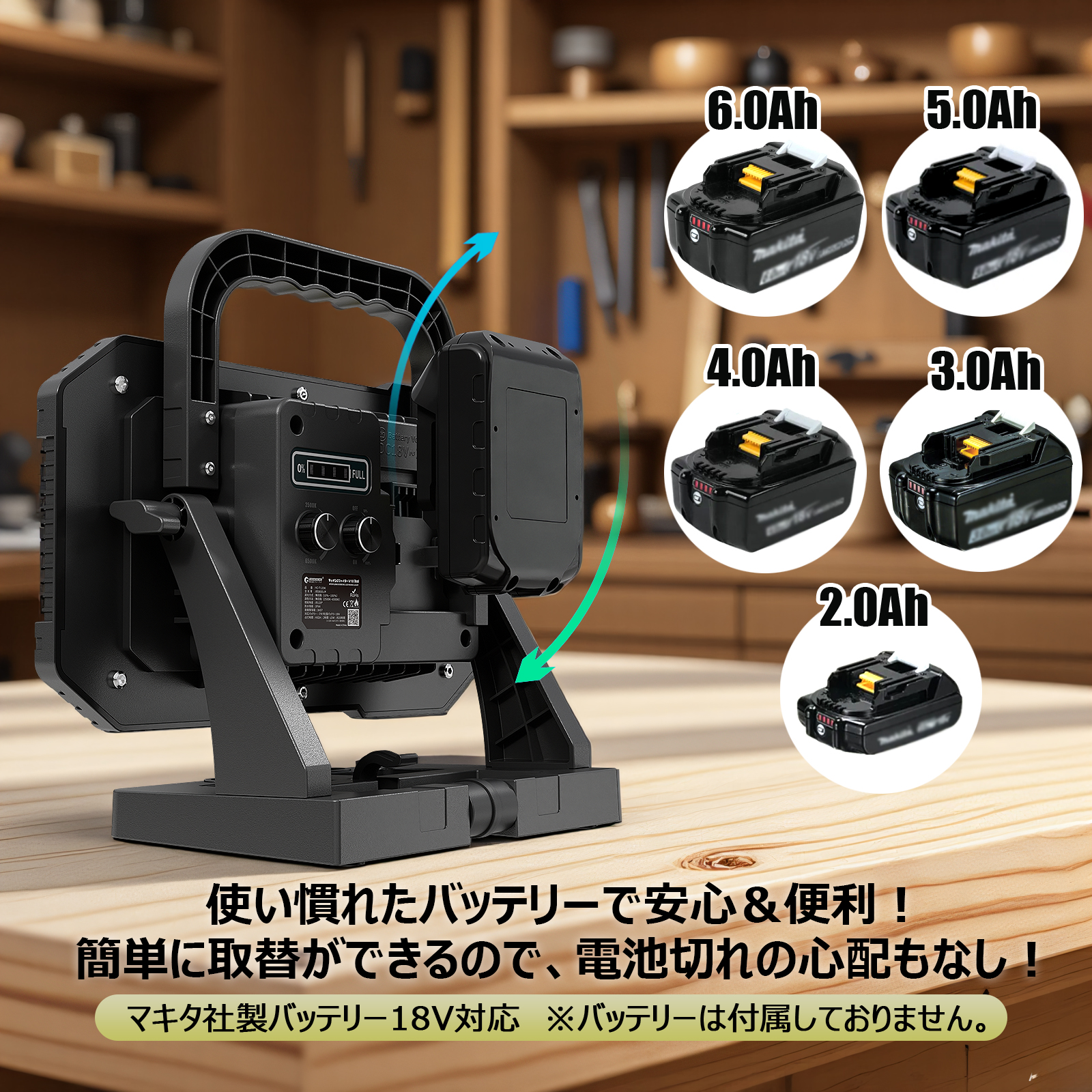 ★オススメポイント★ 着脱式バッテリーで、充電も交換もスムーズ。キャンプや作業現場でもお手軽にご使用頂けます。 120Wのパワーで、10m先までしっかり照らします。作業現場の視野・安全を確保! 明るさ・色温度を無段階で調整。お好みやシーンに合わせて細やかに設定できます。 18Vバッテリー2~6Ah全部対応可能!簡単に交換できるから、充電切れの心配なし!いつでも明るさを確保します。 高い耐衝撃性能で、落下や衝撃からしっかりガード。安心してお使いいただけます。 床置き・手持ち・フック!床に置くだけ、手持ちで移動中の使用も楽々、フックで掛けてハンズフリー!多機能設計で、ニーズにぴったりフィット! 投光器2台搭載可能な三脚スタンドで、照明の角度や高さを自在に調整。更なるパワフルな照明を実現。 |