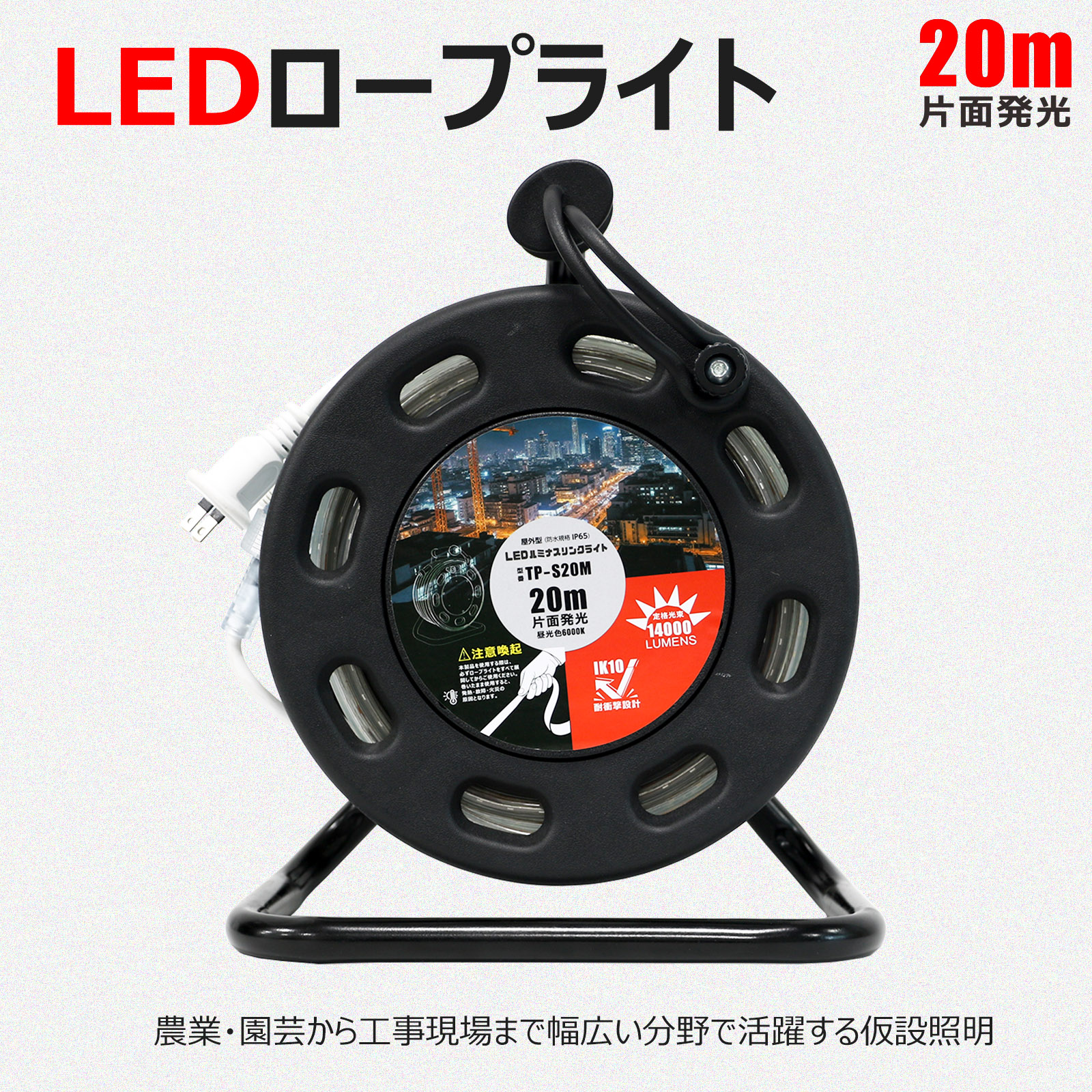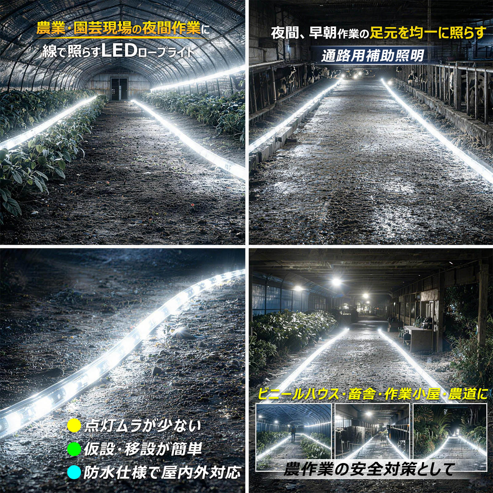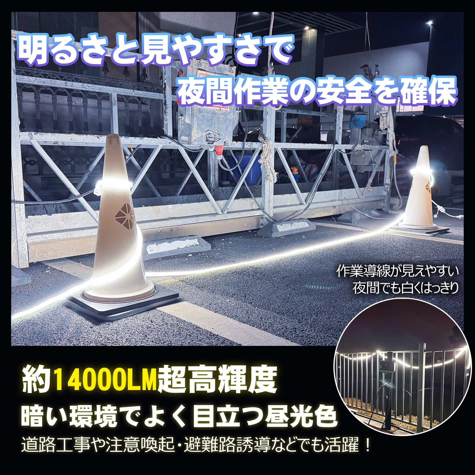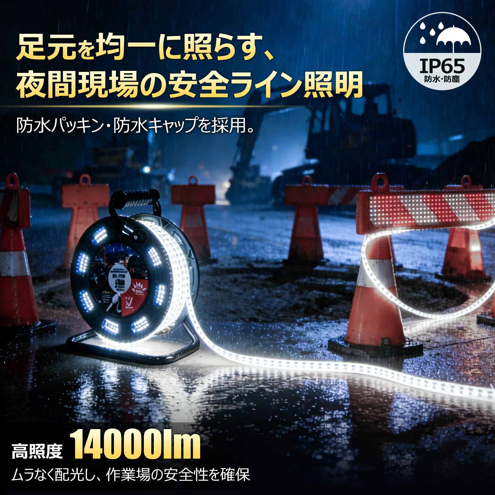 ![]() ![]() ![]() ![]() ![]() ★オススメポイント★ 【高照度14,000lmで夜間作業をサポート】 暗所でもしっかり明るく。 夜間工事や早朝・夕方の作業時間帯でも、安全な作業環境を確保します。 【足元を均一に照らす、片面発光設計】 光を必要な方向だけに照射。 通路や作業動線の足元をムラなく照らし、無駄な眩しさを抑えます。 【20mロングで、広い現場も一本で対応】 長さ20mの一体型設計。 建築現場や農作業エリアなど、広範囲の動線確保に最適です。 【リールドラム式で、素早く巻き取り・スッキリ収納】 横の取っ手を回すだけで、20mのロープライトをスムーズに回収。 片付け作業の手間を大幅に軽減します。 【踏んでも、ぶつけても割れにくい耐衝撃設計】 踏みつけ・落下・資材接触など、過酷な使用環境を想定したタフ設計。 【防水設計で、屋外・雨天でも使用可能】 雨や水しぶきがかかる環境でも使用できる防水仕様。 屋外工事や農作業など、天候に左右されにくく使えます。 使用場面 建築・道路工事の仮設照明、 農業・園芸・ハウス周辺の通路照明として、幅広く活躍します