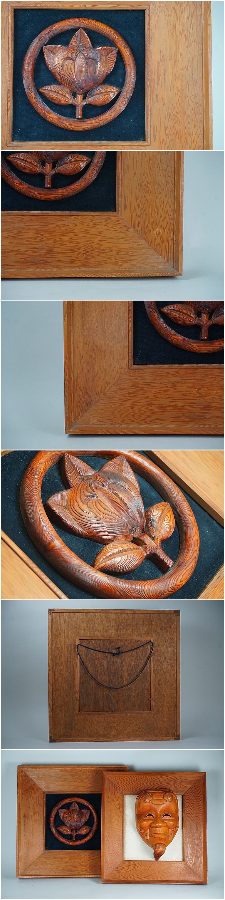 | D-367■屋久杉 額2枚 翁面 家紋 額 古い飾り額 木彫 | ||