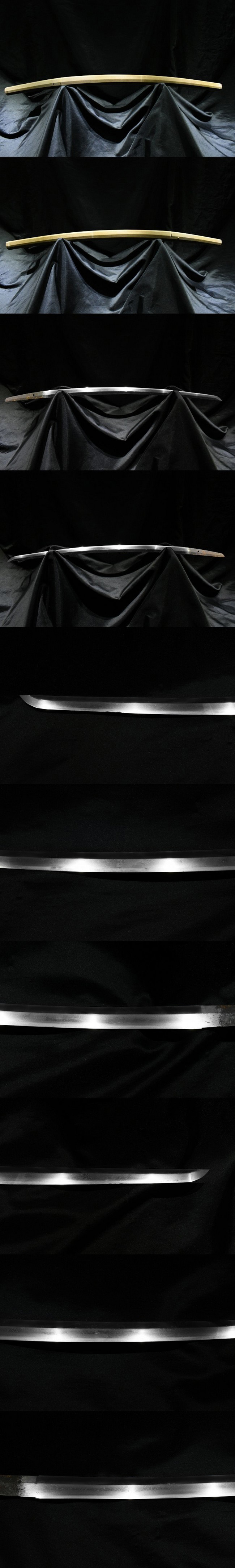 表【飛弾守藤原氏房】 裏【-】 種別: 刀 サイズ:長さ 62.6cm 反り: 2.0cm 目くぎ穴 1個 元幅:約 2.890cm 元重:約 0.617cm 先幅:約 1.679cm 先重:約 0.431cm 刀身重量:約 533.1g(ハバキ・柄をとった状態) ハバキ重量:約 45.0g 鞘全長:約 90.0cm |