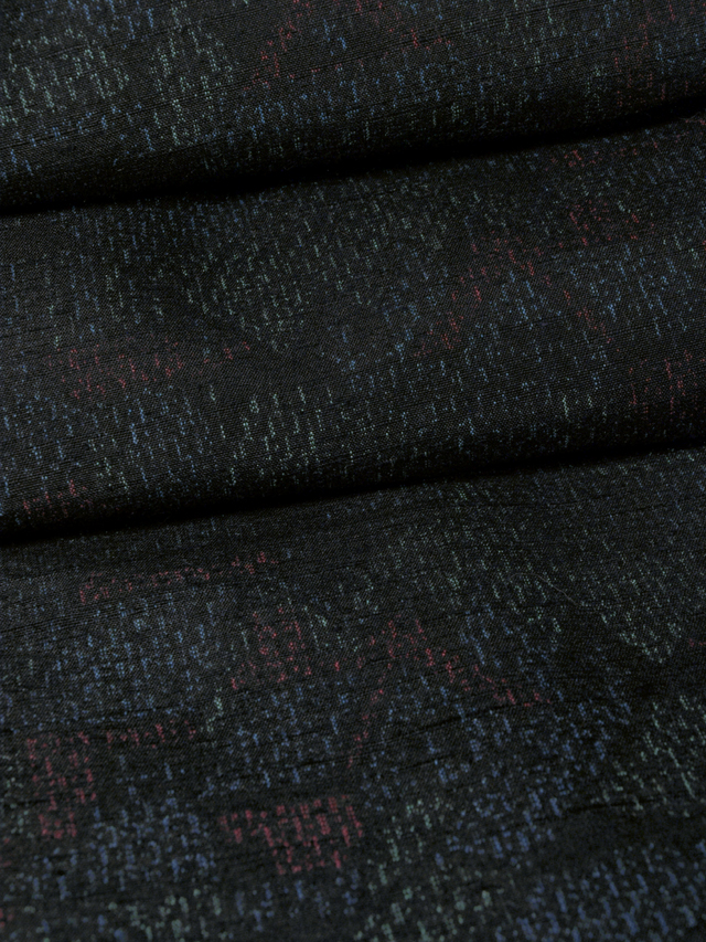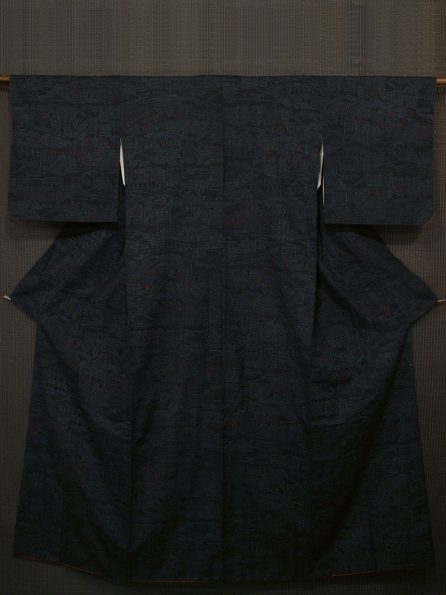 濃藍(こいあい)色の地に、絣の亀甲でかたどられた里山の文様が織り込まれている結城紬です。袷仕立てです。 一見抽象的な感じのする意匠ですが、よくよく見ると連続する山里の家並があらわされていて、おもしろみが感じられます。ほっこりとした紬らしい紬地です。 ユーズド品で、衿裏に直径約 1cm のうすじみが 1 か所、直径約 1mm のよごれが 1 か所ありますが、そのほかに目につくしみやよごれ、褪色などのダメージはなく、きれいな状態です。 |