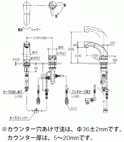 | 整流&スポット微細シャワー、ソフトサーモ、クイックジョイント 逆止弁付 吐水口長さ135ミリ ホース引出し長さ35センチ 取付厚み5~20ミリ | ||||||||||||