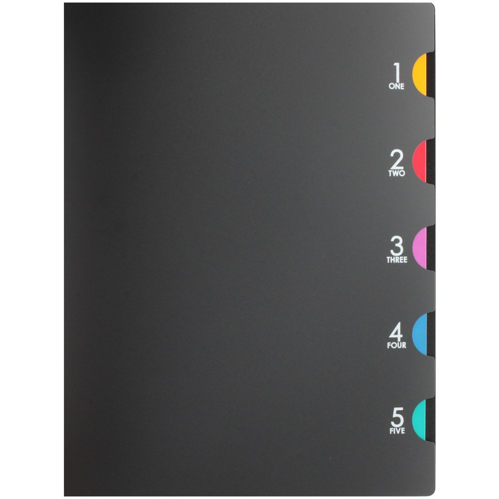 ・ブラック B5 F905・Size:B5Color:ブラック・書類整理・検索に最適。おしゃれなデザインで作業効率がUPするバインダーです。・シンプルな黒い表紙にカラフルなインデックスのカラーが映え、検索・分類に最適です。・【サイズ】B5(26穴) 縦275×横208×背幅20mm・【バインダー】プラスチックバインダー リング内径:10mm(標準収容枚数:約70枚)・【本文】ラミネートタブインデックス5山 ルーズリーフ20枚(6mm横罫)説明 表紙に1~5までの半円状のカットがあり、そこからインデックスが覗いているところが オシャレで特長的なバインダーです。 インデックスとデザインがマッチして、使い方のイメージがひと目で分かる画期的商品です。 シンプルな黒い表紙にカラフルなインデックスのカラーが映え、検索・分類に最適です。 ファイブチャートの名前は、5山インデックスと連動したデザインからつけました。 表紙の5つのカットで、インデックス別に開閉しやすくなっています。 見出し部分には、油性ペンで記入できます。 ルーズリーフ6mm横罫20枚がセットになっているので、すぐに使い始めることができます。 ラミネート加工したインデックスですので、丈夫で長期使用が可能です。 片手でも簡単に開閉しやすいバインダーを採用しました。 バインダー下部の白いつまみを下にはずし、右側にスライドさせて簡単に開けます。 MADE IN JAPAN ※掲載商品の内容は2019年4月現在のものです。仕様は諸般の事情により予告なく変更することがあります。 ※商品によっては写真と色が多少異なる場合がございます。予めご了承ください。 商品名:マルマン バインダー ファイブチャート B5 26穴 F905| お取引きについて【必ずご確認下さい】 | ||||||||||||||||||||