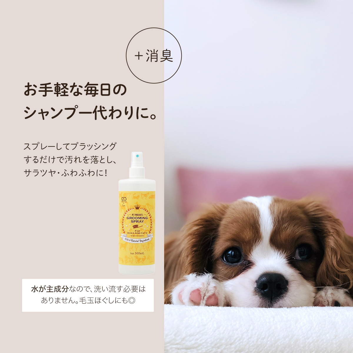 | 説明 | スプレーをしてブラッシングをするだけでサラツヤでフワフワの毛並みに変身! 皮脂汚れを溶かして分解し、毛のキューティクルを傷めずに汚れを取り除きます。 シャンプーやトリートメントとは違い洗い流す必要が無いので毎日お手軽にご使用頂けます。 人にも使用できるグレードの成分を使用していますので、使用する方の肌荒れのリスクも軽減。 成分そのものに除菌効果があるので、防腐剤も不使用。もちろんノンアルコールです。 |