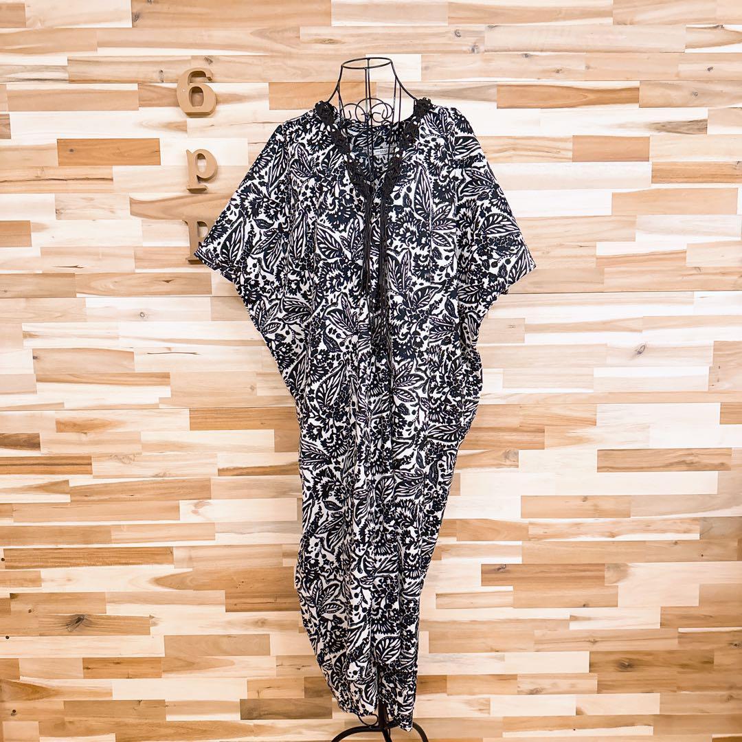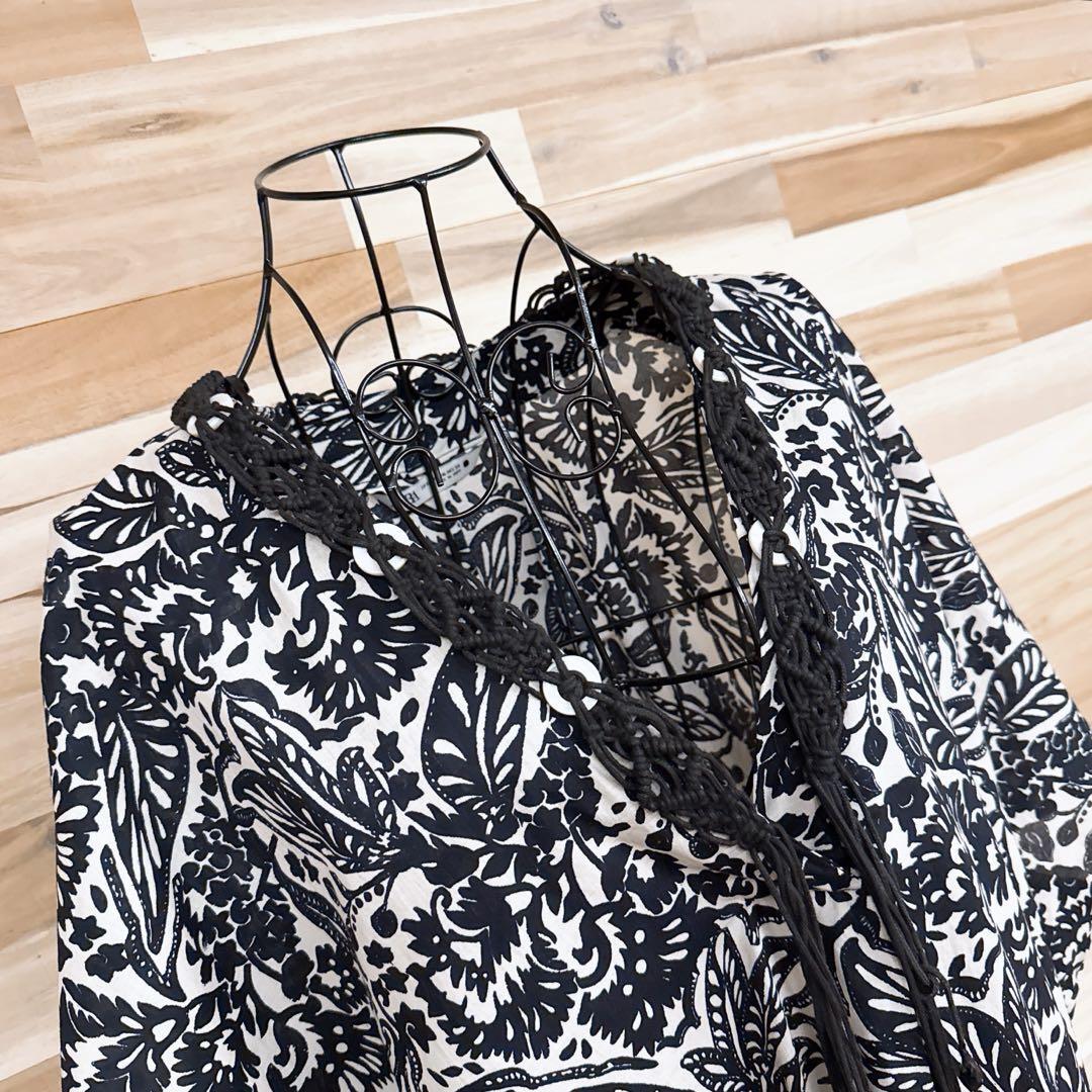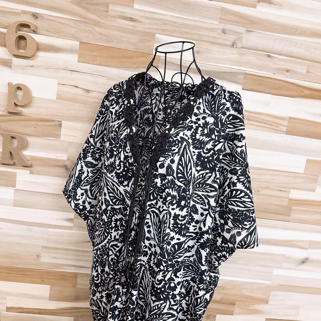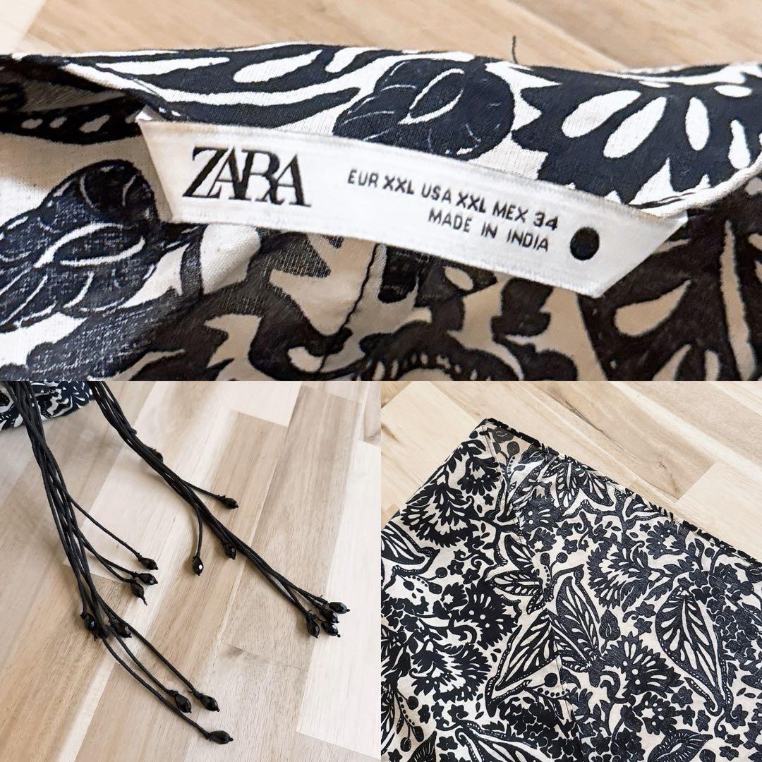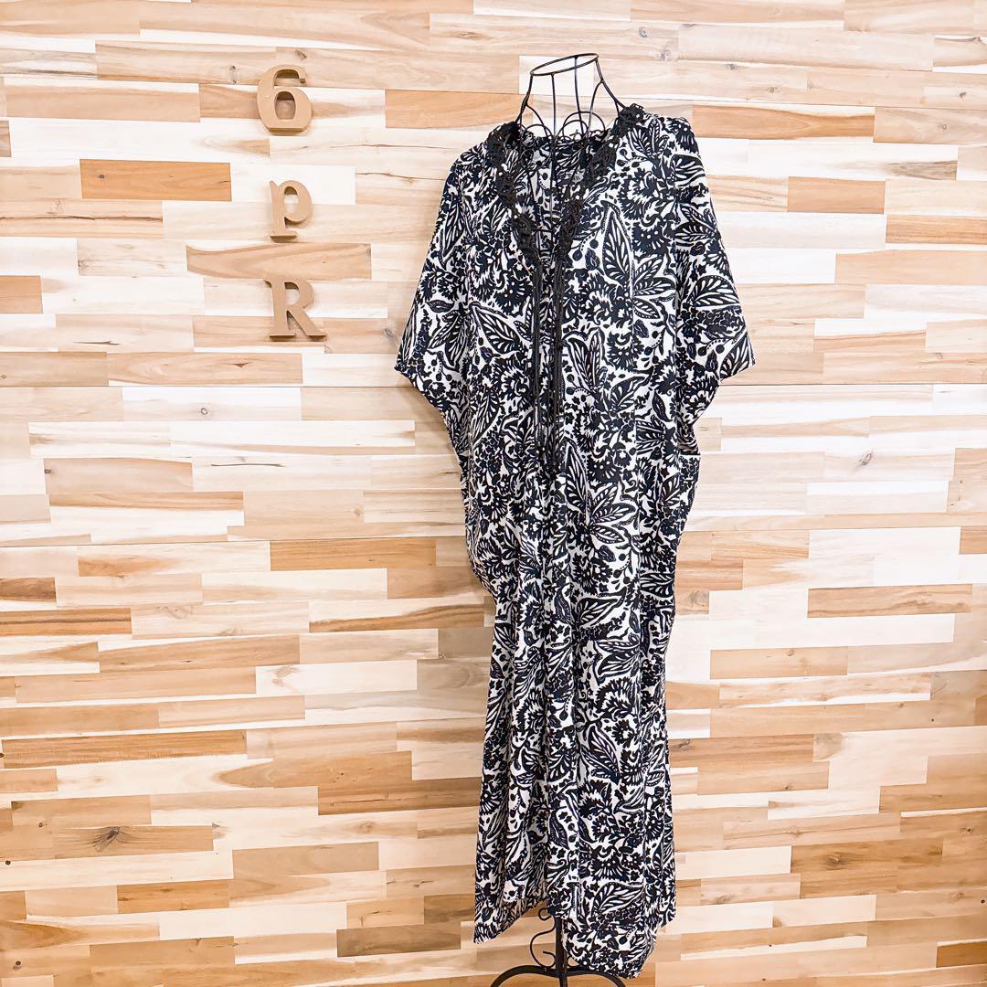 * 5107/243/064 *軽やかなコットン素材で仕立てた、風通しの良いドレープ感が魅力。モノトーンベースのボタニカル柄に、編み込みコードと小粒ビーズのアクセントが映える首元が印象的。ゆるやかなオーバーサイズシルエットで、抜け感のあるリラックスした着こなしが完成。リゾートシーンにも、デイリーにもなじむ個性派スタイルのZARAのワンピースです。※LGスタイラーにて除菌リフレッシュ・スチームクリーニング済みです。