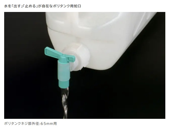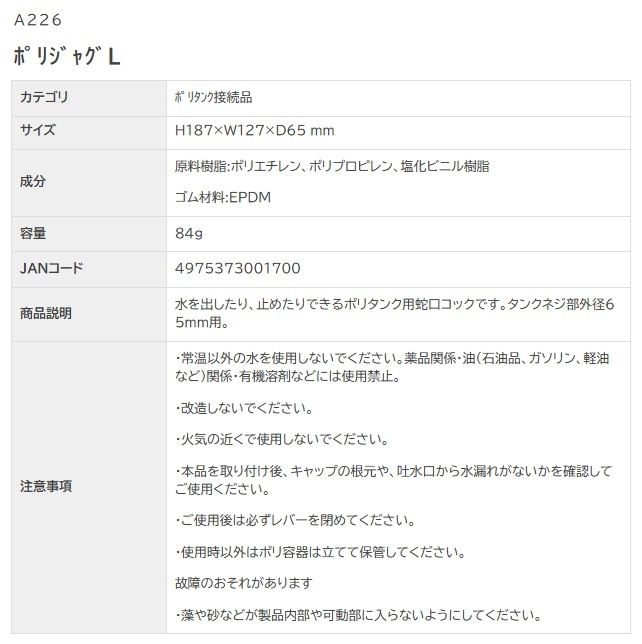 タカギ TAKAGIポリジャグLA226■商品説明水を出したり、止めたりできるポリタンク用蛇口コックです。タンクネジ部外径65mm用。■サイズ・H187×W127×D65 mm■容量・64g■成分・原料樹脂:ポリエチレン、ポリプロピレン、塩化ビニル樹脂・ゴム材料:EPDM■注意事項・常温以外の水を使用しないでください。薬品関係・油(石油品、ガソリン、軽油など)関係・有機溶剤などには使用禁止。・改造しないでください。・火気の近くで使用しないでください。・本品を取り付け後、キャップの根元や、吐水口から水漏れがないかを確認してご使用ください。・ご使用後は必ずレバーを閉めてください。・使用時以外はポリ容器は立てて保管してください。故障のおそれがあります・藻や砂などが製品内部や可動部に入らないようにしてください。