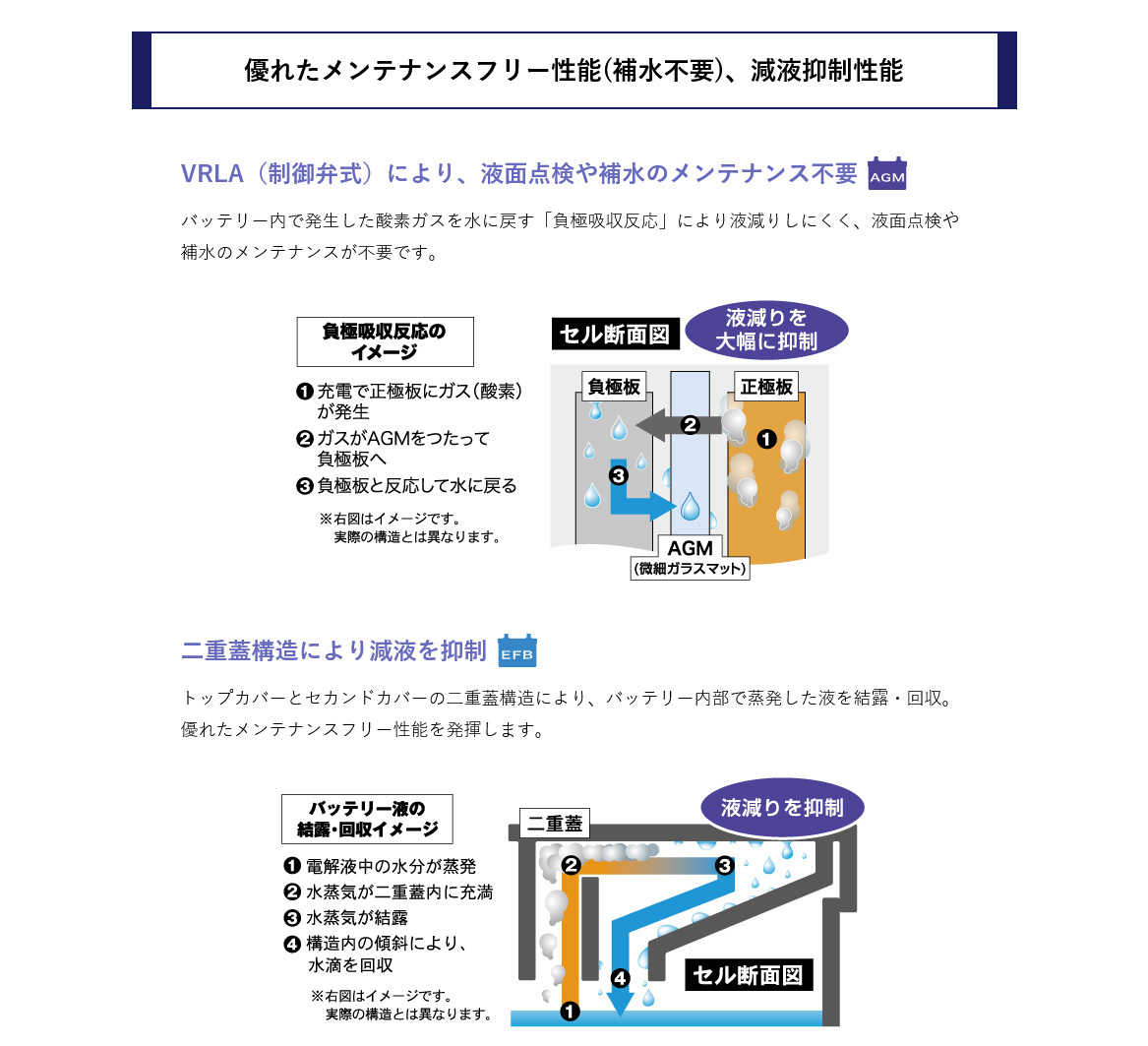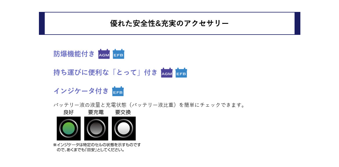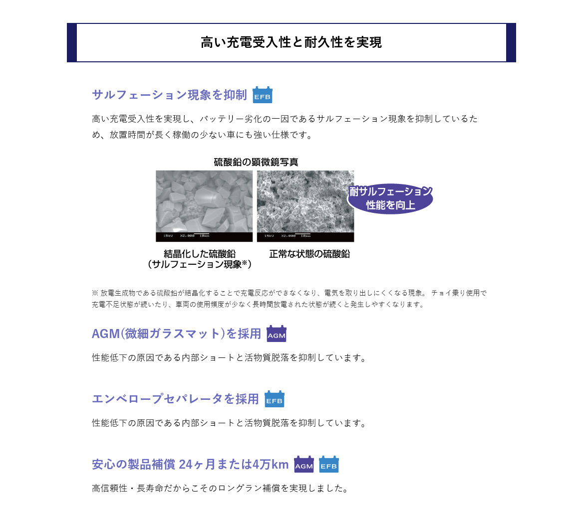 | ■商品説明 | 高い充電受入性と耐久性を実現 *サルフェーション現象を抑制(EFB) 高い充電受入性を実現し、バッテリー劣化の一因であるサルフェーション現象を抑制しているため、放置時間が長く稼働の少ない車にも強い仕様です。 *AGM(微細ガラスマット)を採用(AGM) 性能低下の原因である内部ショートと活物質脱落を抑制しています。 *エンベロープセパレータを採用(EFB) 性能低下の原因である内部ショートと活物質脱落を抑制しています。 *安心の製品補償 24ヶ月または4万km(AGM)(EFB) 高信頼性・長寿命だからこそのロングラン補償を実現しました。 |