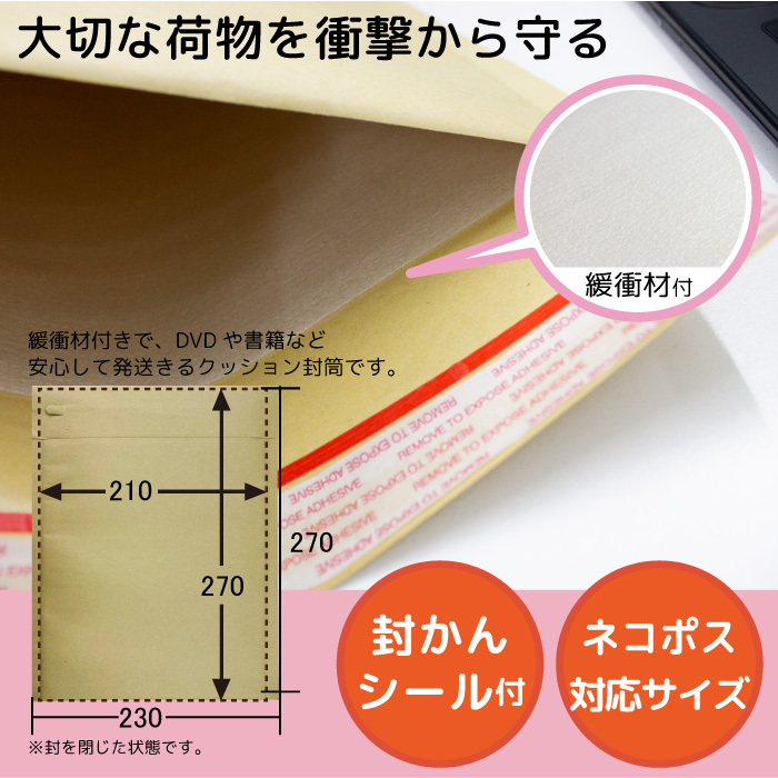 | メルカリやなど、個人配送でも大活躍! 緩衝材付きで、DVDや書籍などを安心して発送できるクッション封筒です。 ■内寸 270×210mm ■外寸 270×230mm ■貼りしろ 51mm ■対応 クロネコDM便 ネコポス クリックポスト ゆうパケット ■開封テープ付き |