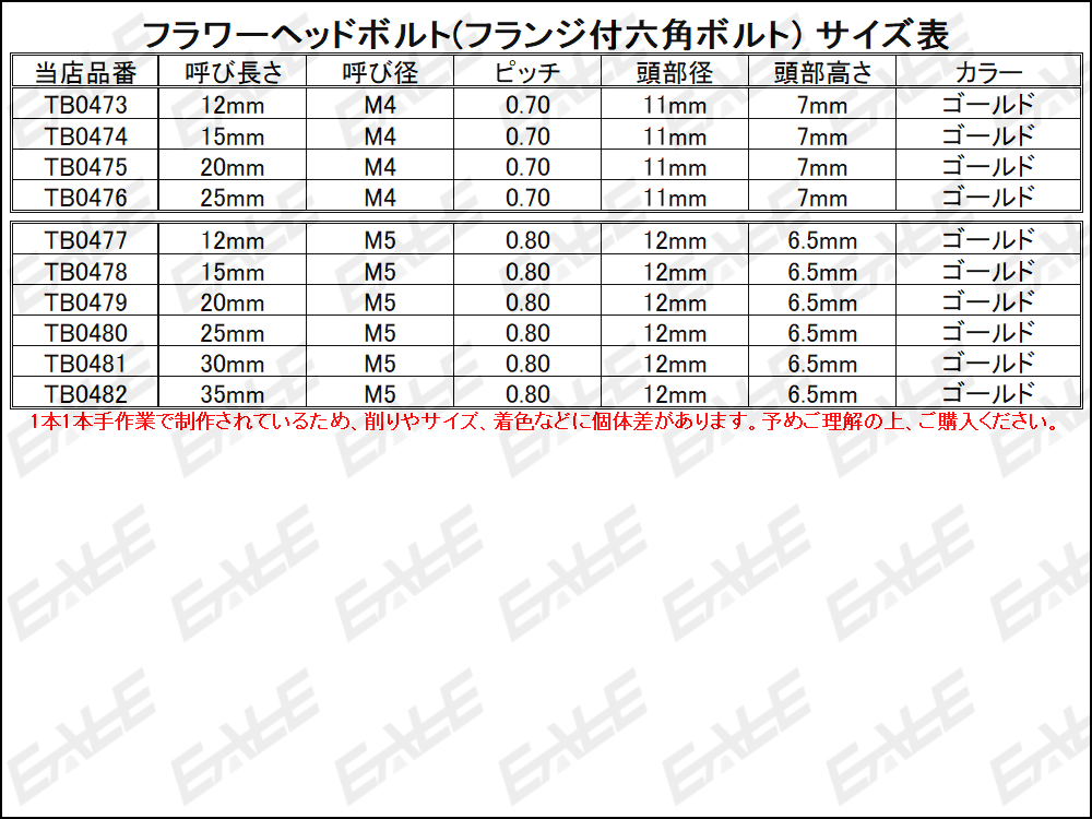 M4フラワーヘッドボルト (フランジ付六角ボルト) バイク保有率が高く、バイクにアツいタイのメーカーから直輸入した“M4フラワーヘッドボルト”です。 丁寧に削り出されたボルトに、金メッキを施した美しい仕上がりで、特にヘッド部分は穴あけ加工がされ、ボルトトップ内が花のような模様になっている普通のボルトにはない独特のデザインです。 ステンレスを使用しているので強度も十分にあり、メーター周辺やキャブ周り、回り止めボルトなどM4が使用されている場所ならどこにでも使用して頂けるよう各種サイズを用意しました。 また穴あけ加工されたヘッドはワイヤーロックが可能です。 ※出品は右記およびタイトルの“呼び長さ”“カラー”です。 ご落札後の変更はお受けできませんので必ずご確認下さい。 他の呼び長さは⇒ こちら 同デザインで違う呼び径・呼び長さ・カラーは⇒ こちら その他の六角ボルト・キャップボルトは⇒ こちら その他のボタンボルトは⇒ こちら その他のネジ(ビス・スクリュー)は⇒ こちら その他のナット・ワッシャーは⇒ こちら |