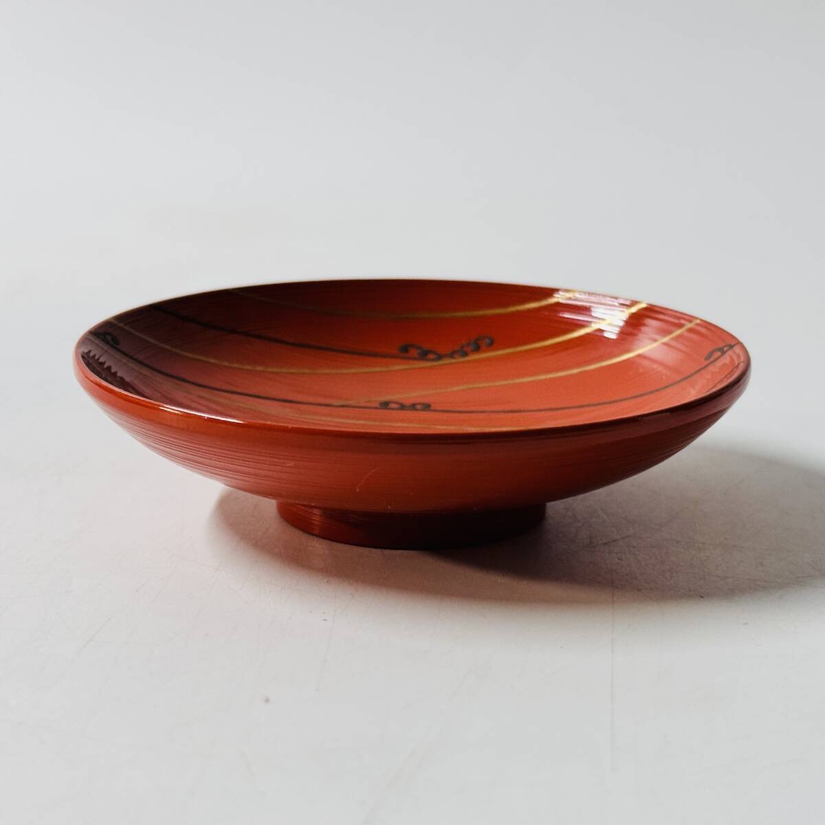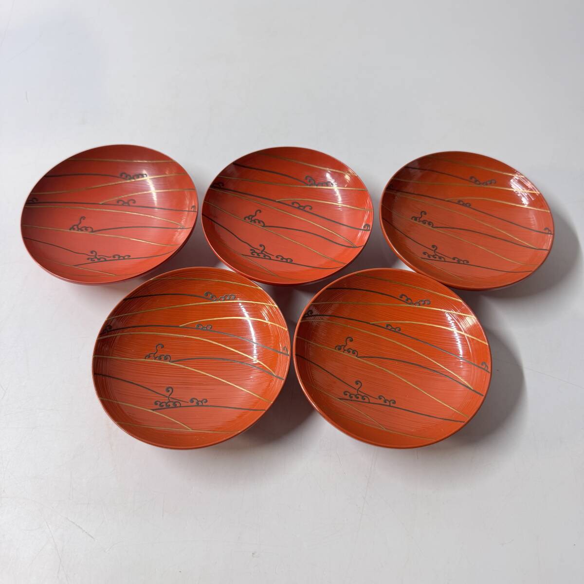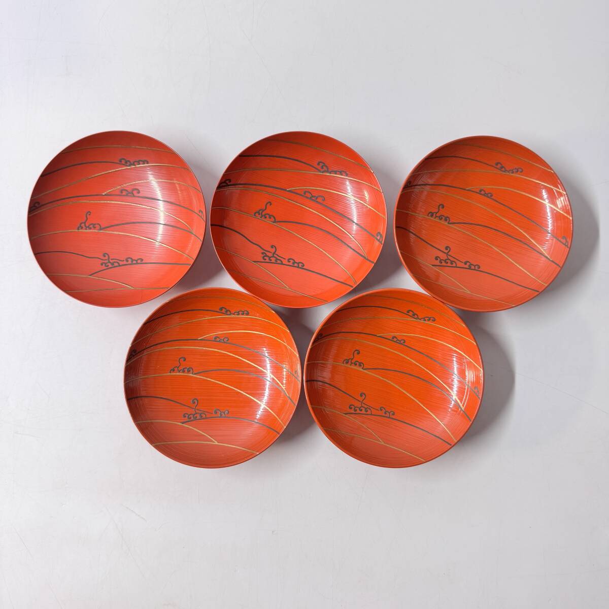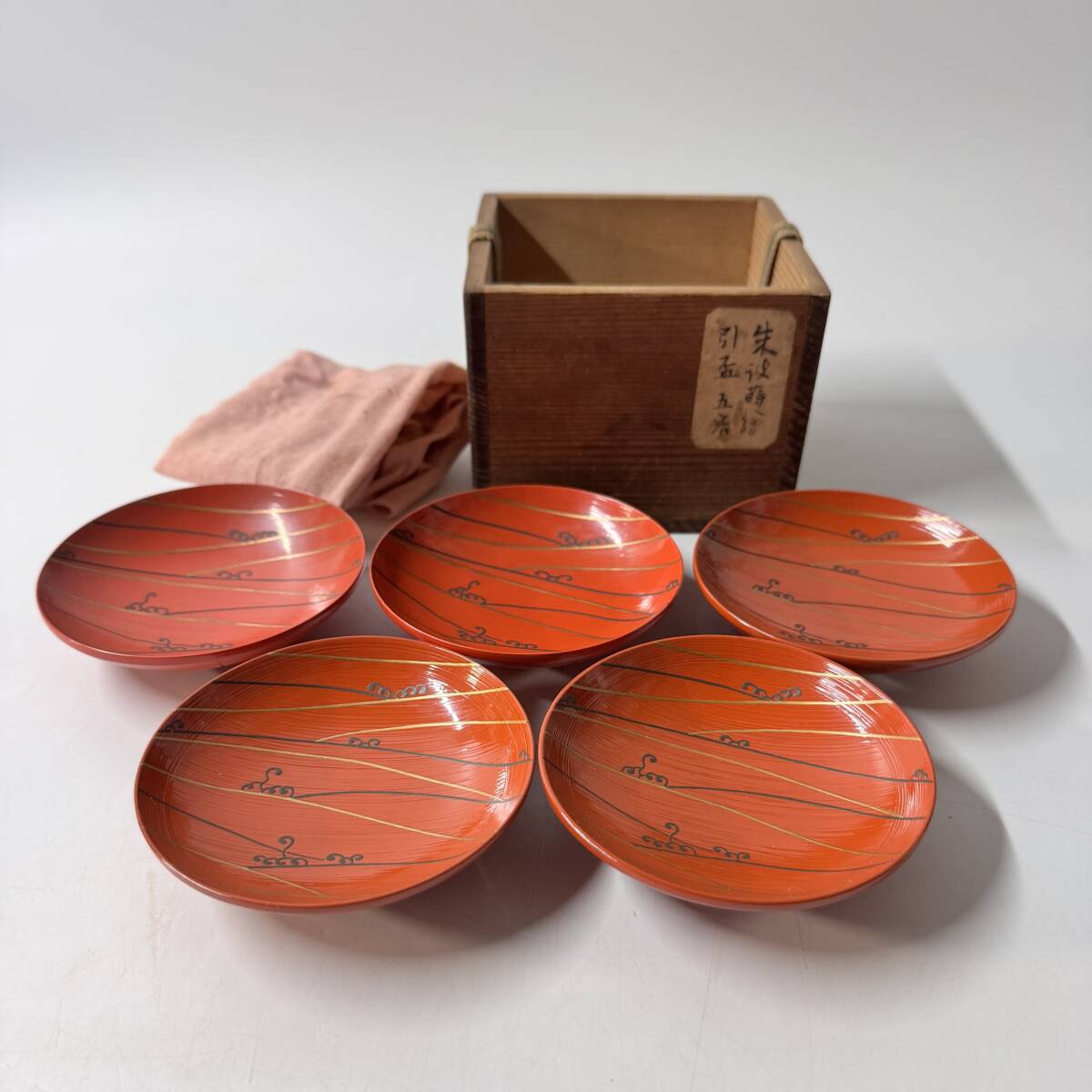 旧家蔵出 漆芸漆器 無銘 朱波蒔絵 引盃 五客 酒器 共箱 共布 経年保管品 現状品の出品です。