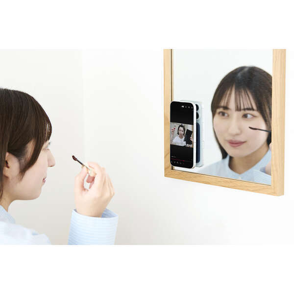 | ●鏡に貼り付ければ、メイク中の画面チェックもスムーズに行えます | |