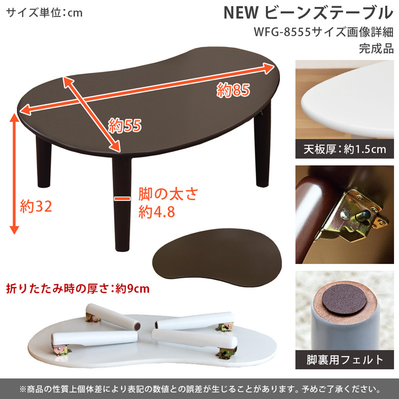 | サイズ | (W)幅85×(D)奥行55×(H)高さ32cm 天板の厚さ:約15mm 脚の太さ:約48mmφ 折り畳み時の厚さ:約90mm |