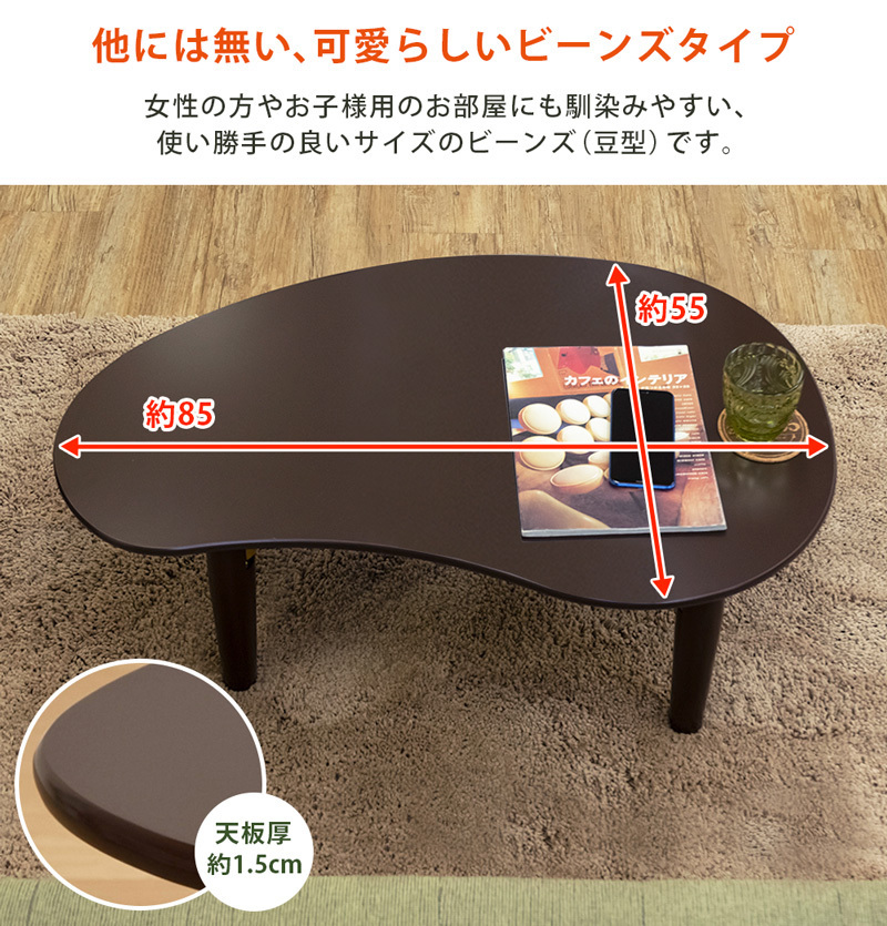 | 商品説明 | 完成品 折りたたみ式で収納もしやすいビーンズテーブル! 側面まで丸みを帯びた可愛らしいビーンズ型のローテーブル。 折りたたみ式で収納場所を取らず持ち運びも簡単です。 くぼみの部分に体を入れれば体のラインにフィットして、使いやすさ抜群! 商品は開封してスグに使える完成品。 |