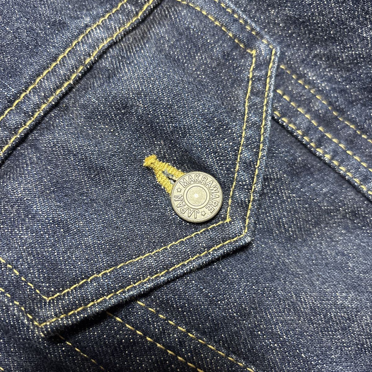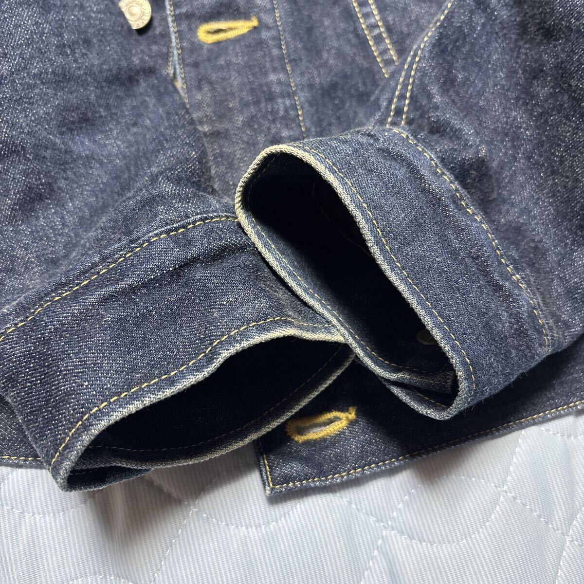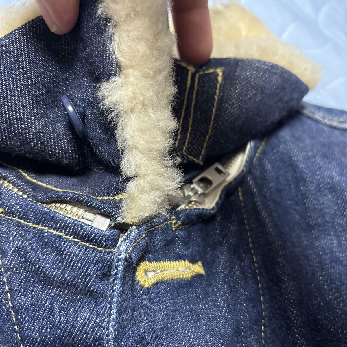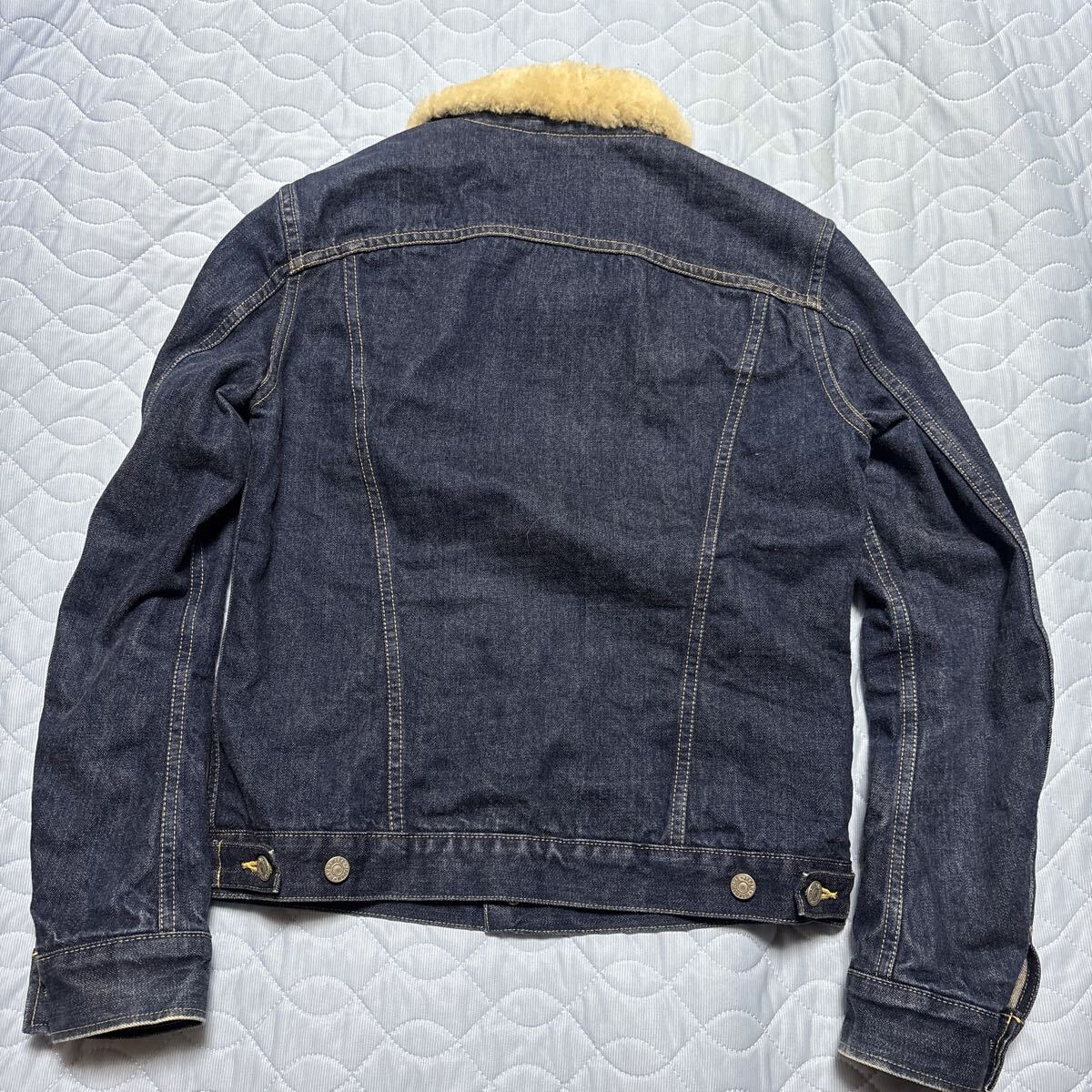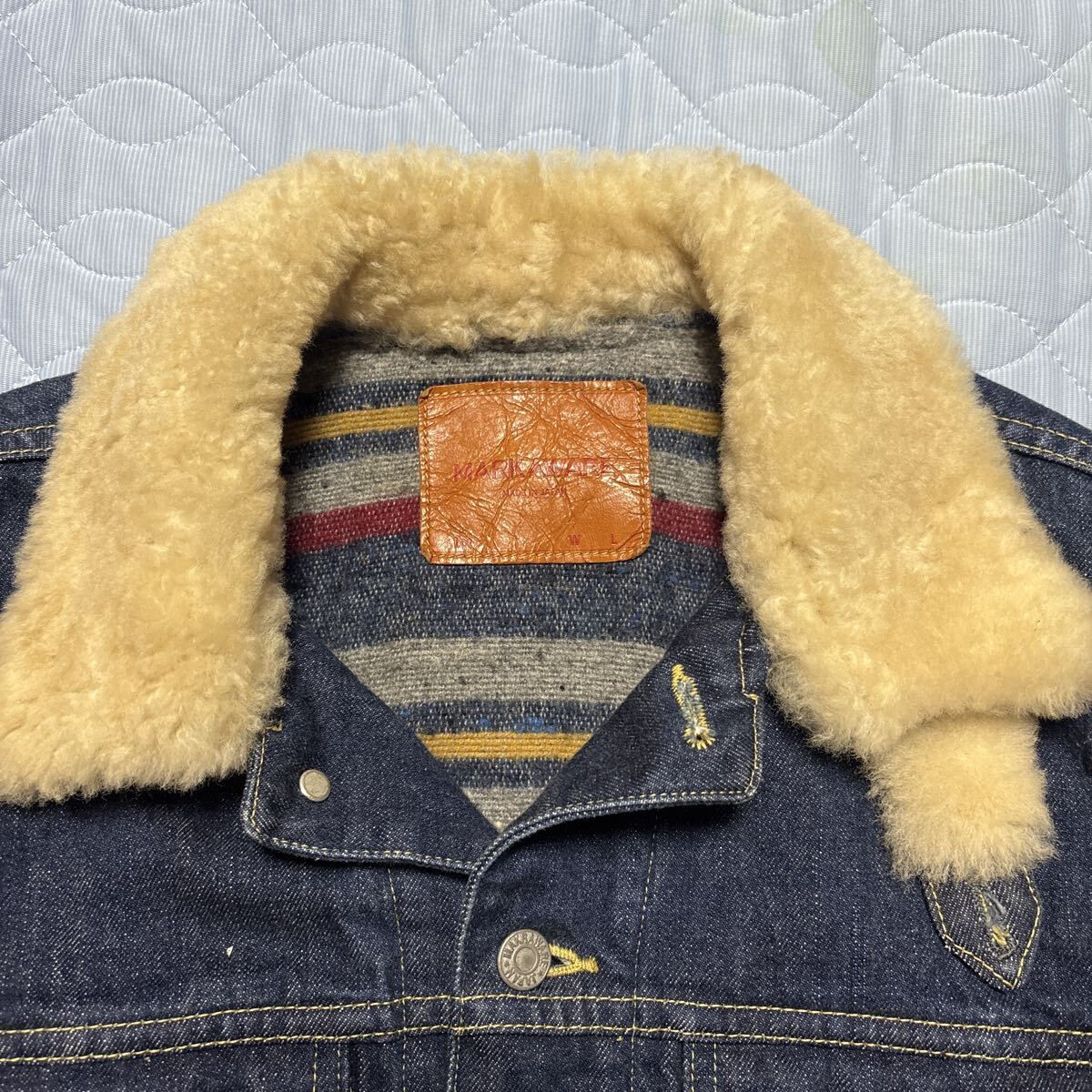 マーカの傑作デニムジャケットです。ストームライダーをリーバイスのサードで再構築した一着です。ウールの裏地と襟のムートンボアでかなり暖かいです。ストームライダーほどタイトではないのでいろいろ合わせやすいです。肩幅43脇下50袖丈64着丈60センチほどです。当方172センチ58キロ手足長めのやや痩せ型ですがちょうどいいサイズです。中古ですが状態はとてもいいです。探されている方よろしくお願いします。