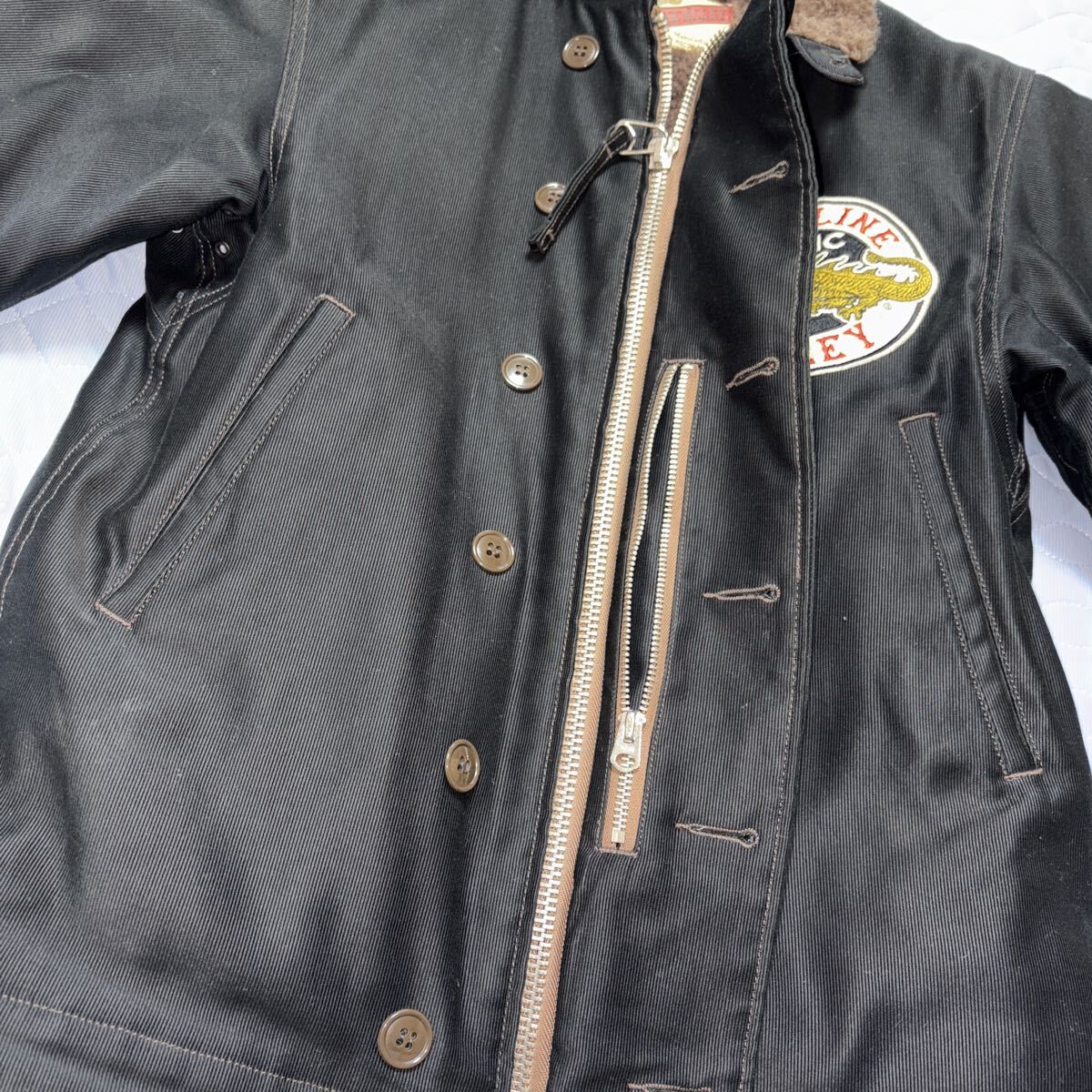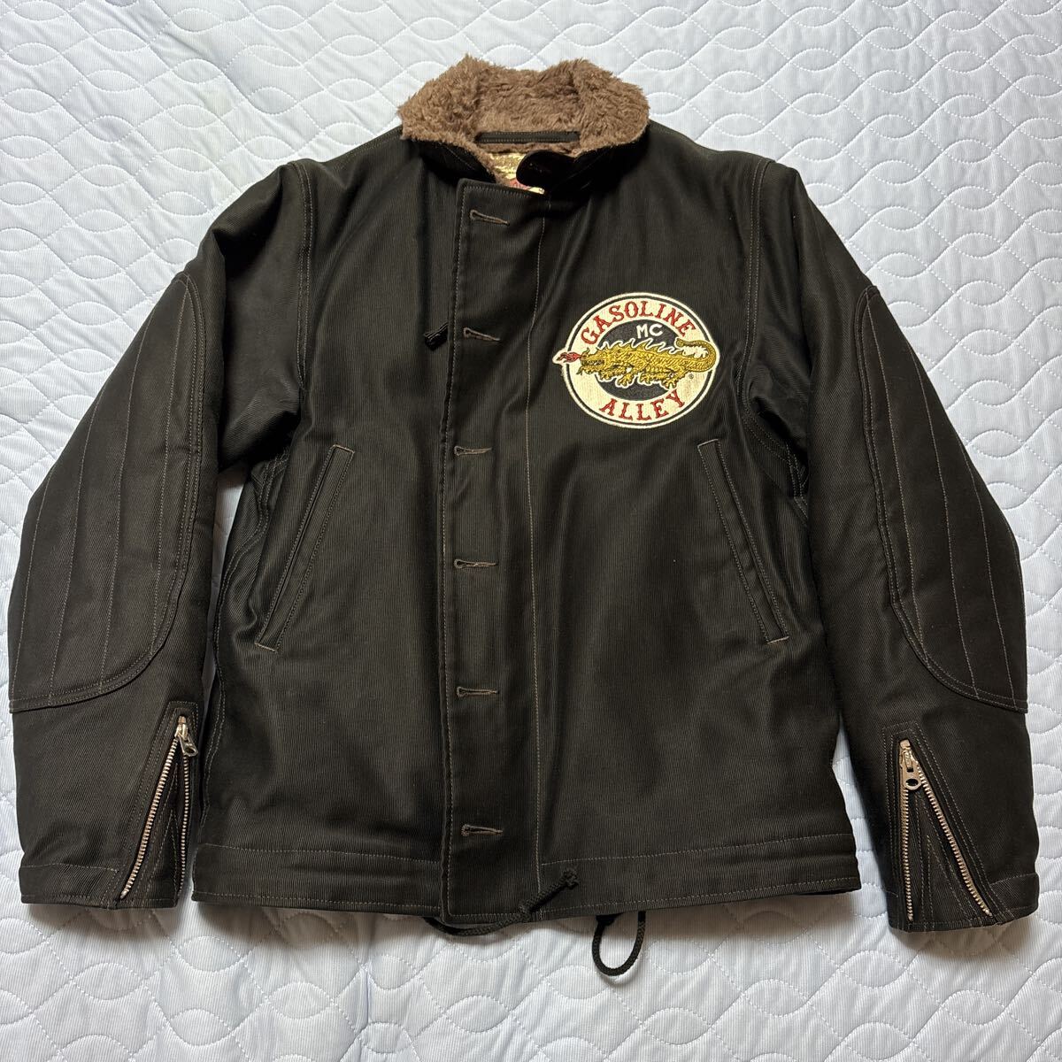 トイズマッコイの傑作デッキジャケットです。サイズはSです。当方172センチ58キロ手足長めのやや痩せ型ですがちょうどいいサイズです。東洋やマッコイズのアウターが36の方なら問題なく着れると思います。こちらはN-1をモチーフにバイク乗り向けにデザインされてます。若干ショート丈にアームホールは大きめ、厚手の生地に裏地はアルパカで防風防寒性ともに素晴らしいです。袖のジッパーのおかげでガントレットタイプのグローブも合わせれます。グローブをしたまま内ポケットのジッパーも触れるように配慮されてます。2月のツーリングでも中にインナーとセーターだけでも平気でした。当方色違いで所有しておりこちらはタンス保管のとてもきれいな状態です。探されている方よろしくお願いします。